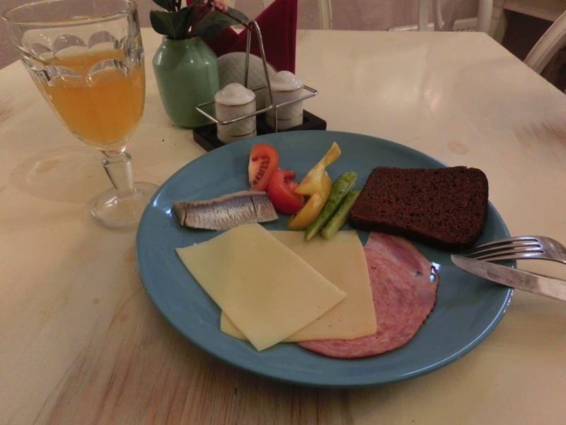 7時に朝ごはんへ。一番乗りなのでビュフェがきれいに並んでいる。8時半にはホテルを出るので軽くしようと思いながら、結局ハムやチーズや酢漬け魚やサーモンなどと、いろいろと食べてしまいます。