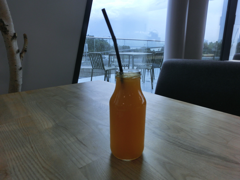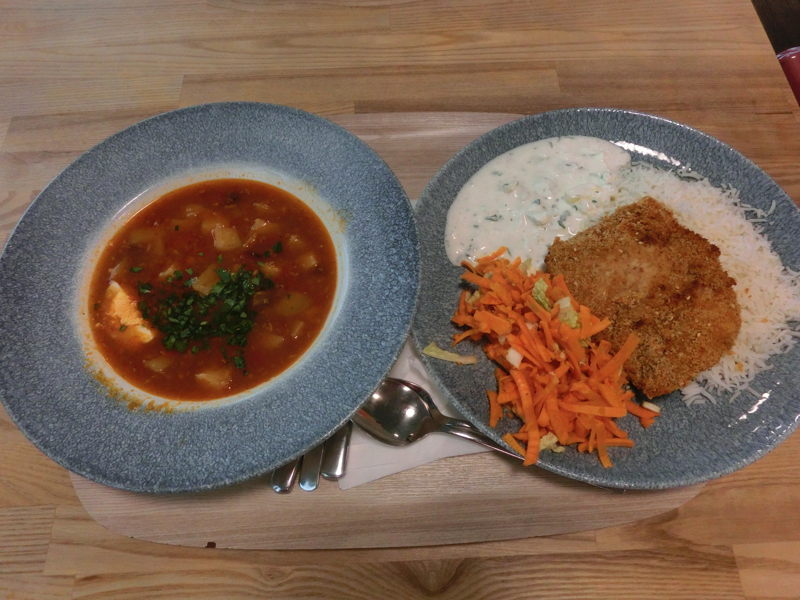 ランチはトマトのスープとセサミチキン。スープはジャガイモと青魚が入っていておいしいセサミチキンはやわらかい鶏肉のカツで、ゴマが香ばしい。付け合わせのライスが大量だが、スープに少し浸して食べるとちょうどいい。2人でちょうどいいランチとなりました(13.1)。あとはチェックインまでのんびりしますか。途中、久しぶりのフレッシュオレンジジュースを飲みながら、ストックホルムやヘルシンキの研究だ(3.9)。こういう場所があってよかったな。