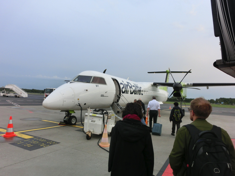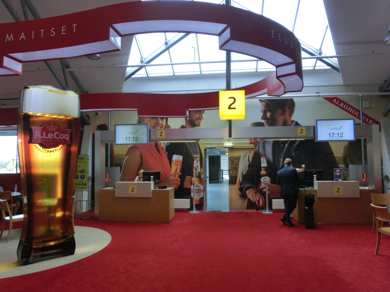 16時半を過ぎ、そろそろチェックインの時間。カウンターの周りに人が集まり始めたので並びましょう。手続きが始まると、あっという間に長い列ができました。席は予約済みなので手続きもスムーズ、出発ロビーへ行きましょう。セキュリティチェックに免税店を過ぎると、そこは出発ゲート。ここタリン空港はそのデザインの奇抜さが知られているようだが、確かにいきなりレクサスがあったりするし、ゲート前の待合場所がそのままパブになったりしている。ゲートそのものも、単なるドアではなく電車のデザインになっていたり、なんと卓球台があったりもする。なかなか面白い空港だね。まだ時間はあるのでビールでもいただきますか。本当はシーフードの炒め物を一緒に頂きたかったがちょっと順番待ちで時間がかかるとのことで、ピザとともにいただきましょう。飛行機を見ながらのひと時、いいですね(11.8)。