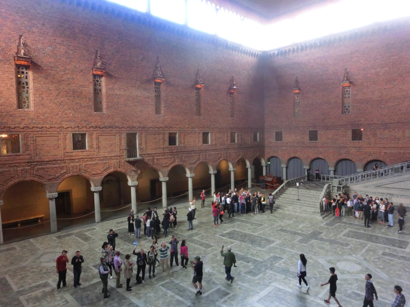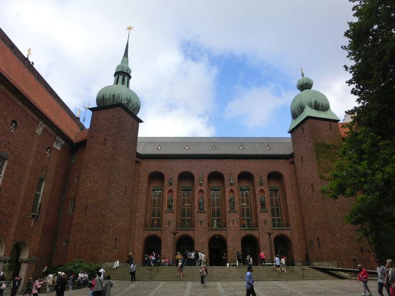 ホテルをチェックアウト。荷物を預かってもらい、ホテルを出る。まずは市庁舎に向かいたいが、道が入り組んでいてよく分からない。とりあえず目の前にストックホルム中央駅があるので入ってみると、ちょうどインフォメーションがあったので聞いて見ましょう。行き方を教えてもらい、本当にここか、という道もありつつも進んでいくと、線路を越える道を行く。そして駅の向こう側にいくことができた。あとは市庁舎までは道なり、無事に到着しました。