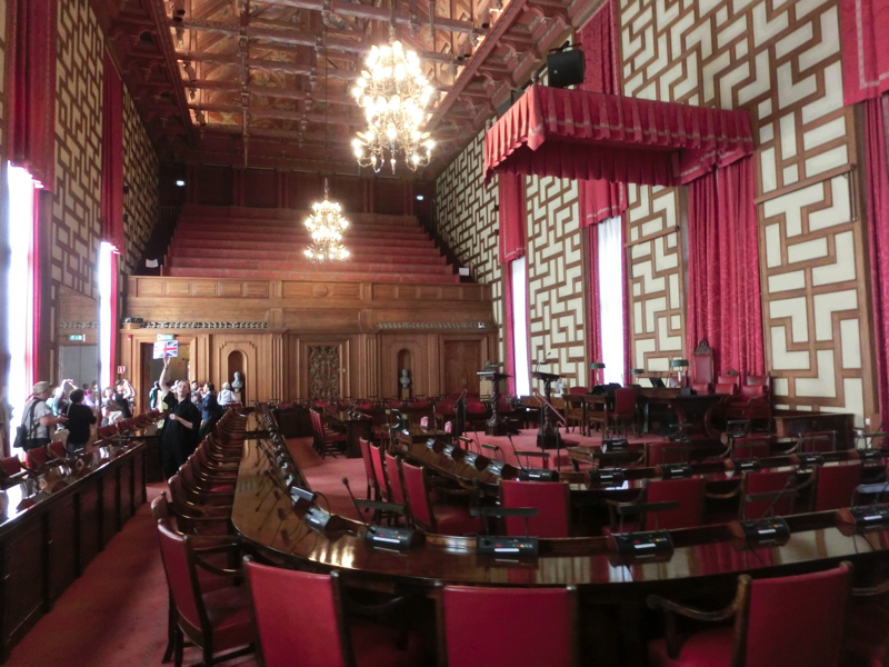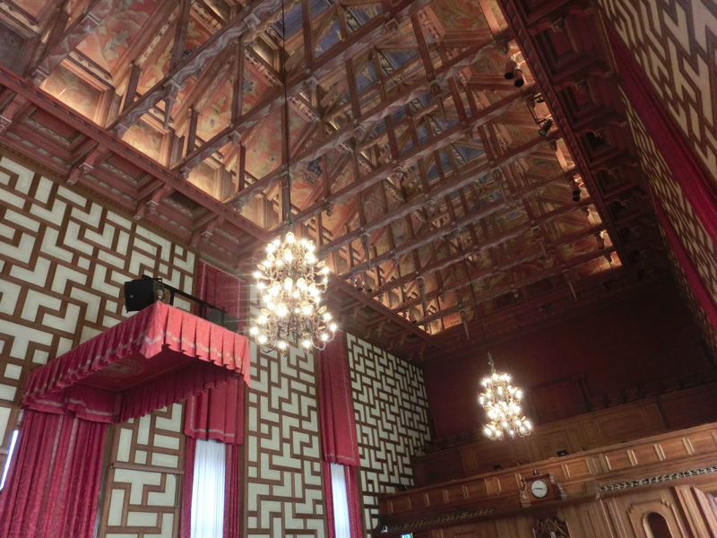 ここにたくさんのテーブルが並べられ、たくさんのゲストとたくさんのウェイターがこの場に勢ぞろいするわけですね。この部屋は「ブルーホール」と呼ばれているが、レンガ造りなので青いイメージはない。本当は壁を青く塗る予定だったが、あまりにこのレンガが美しいためにこのままの状態になっているらしい。確かにきれいな部屋ですね。そんな説明を受けながら上のフロアへと行き、ガイドさんについていくと途中に市議会議事堂が。座席はそれぞれ名前が書いてあり、投票ボタンがあるなどリアルな会議が想像できる。この部屋の天井の梁が複雑な形状をしているのは、ヴァイキングの建築様式とのこと。