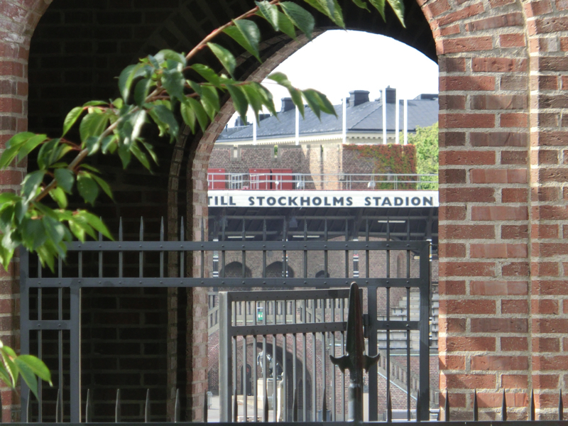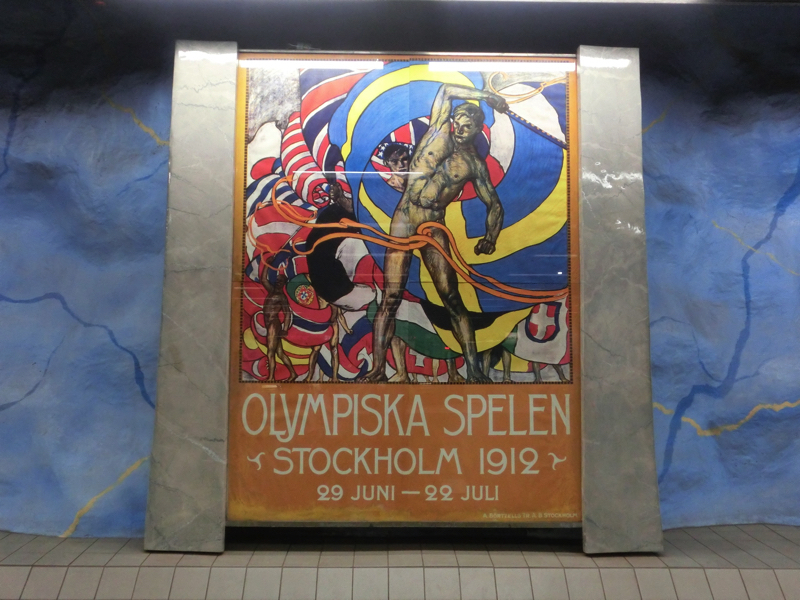 市庁舎を出て、ストックホルム中央駅へ。ここからメトロに乗り、10分ほどでStadion駅に到着(@45)。駅の構内はまるでトンネルを掘った後の岩肌がそのまま残っているようで、それが青をベースとしてカラフルに色付けられていてとても不思議な空間になっている。ストックホルムの地下鉄はこうした造りのところも多いようで、そうした駅をめぐるツアーなんてのもあるようです。われわれの目的は、ここで1912年に行われたオリンピックスタジアムに行くこと。そう、大河ドラマ「いだてん」の序盤の舞台になった場所だ。100年以上前に行われたオリンピックのメインスタジアムがまだ残っていることもすごいし、いまだに使用されているとのこと。