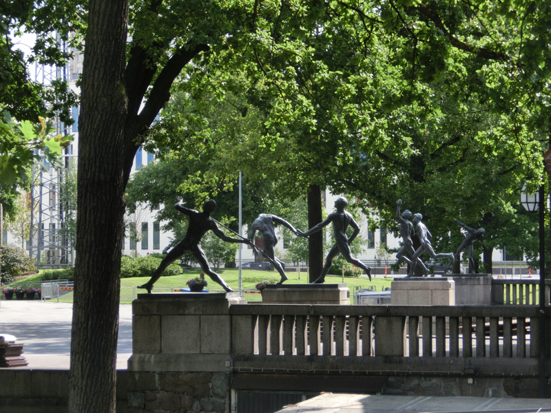 スタジアムに到着すると、ちょうど中で何か作業をやっているようだ。普段ならば中も見学できるのに今日は入れないとのことで、聞いてみると数日後に行われるRamsteinのコンサート準備中。リガでのホテル不足はRamsteinのコンサートが原因だったが、われわれの前に立ちはだかってくれるぜ・・・Ramsteinめ。どんなバンドか全く知らなかったが、ドイツのベテランヘビメタバンドだそうで。仕方がないので、外からしっかり見よう。中の様子も少しは見え、よく見ると観客席にVALKOMMEN TILL STOCKHOLMS STADIONと書かれている。いだてんの中でもこんなシーンを見たような気がするね。スタジアム沿いをずっと歩き、メインゲート前まで来た。オリンピックに関するレリーフが見えるし、各競技を表した銅像も見える。ここで実に107年前、日本人が初めて参加したオリンピックが行われた。日本からは本当に遠かっただろうなあ。そして来年は東京オリンピック、いい大会になってほしいものです。