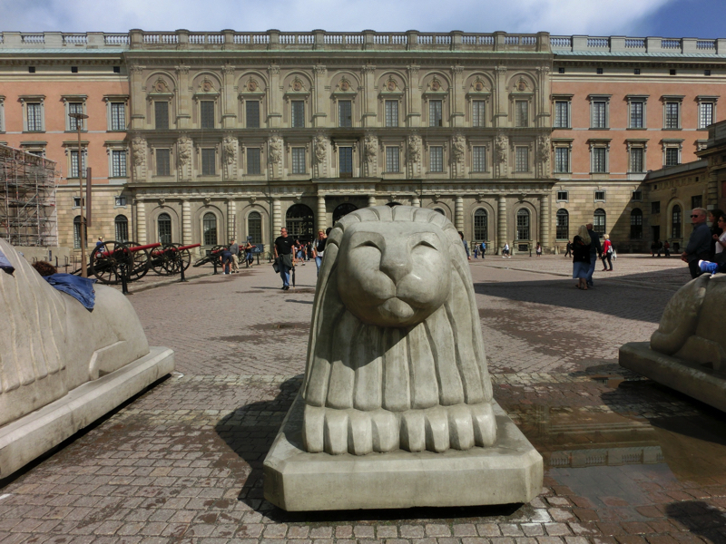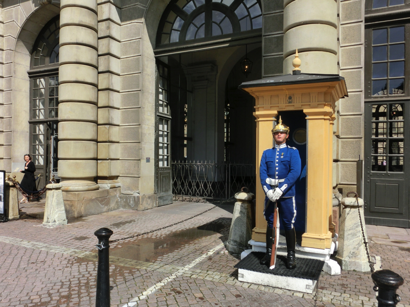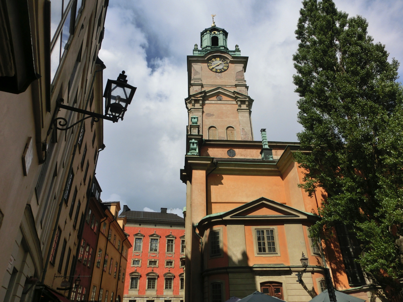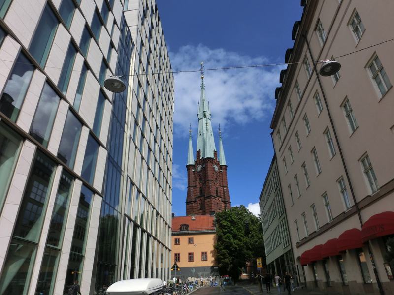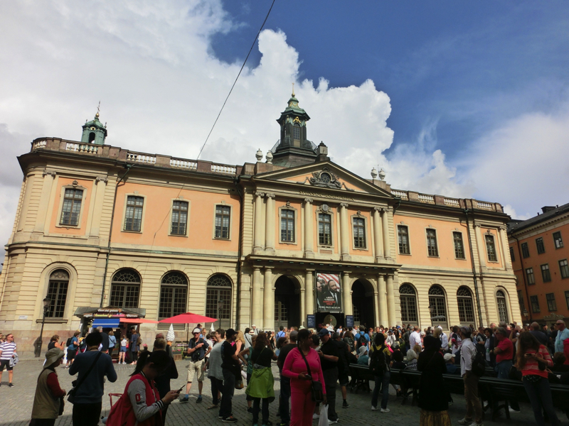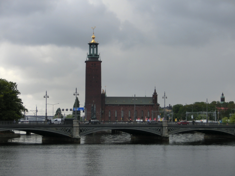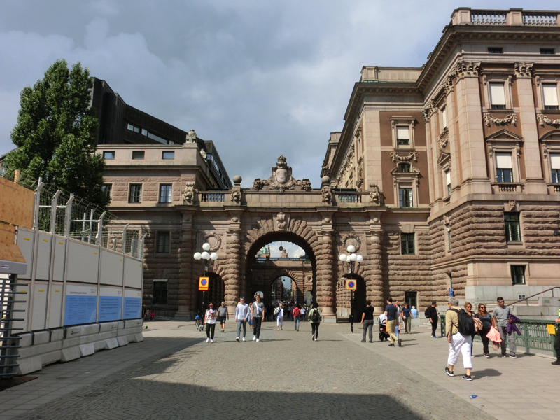 ここからホテルへ向かって歩いていくが、その途中の橋からは朝に行った市庁舎が見えた。そのまま周りをみると、今回は行けなかったがリッダーホルム教会も見える。そして先へ歩くと国会議事堂を通り抜ける。このあたりは、まさにストックホルムの中心街といった感じだ。少し雨が降ってきたかな。賑やかな街並みをぶらぶら歩き、ホテルに戻ってきた。荷物を受け取り一息ついて、では港へと向かいましょう。