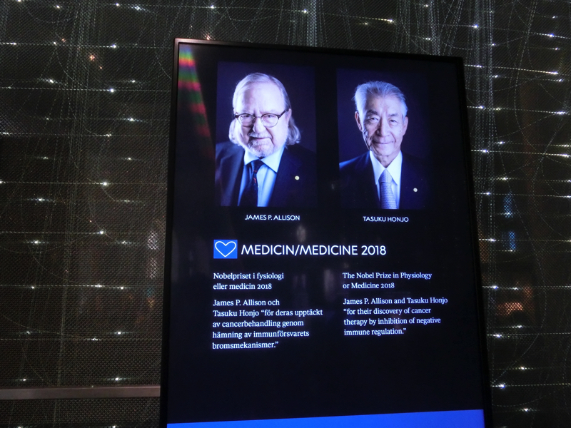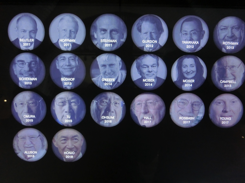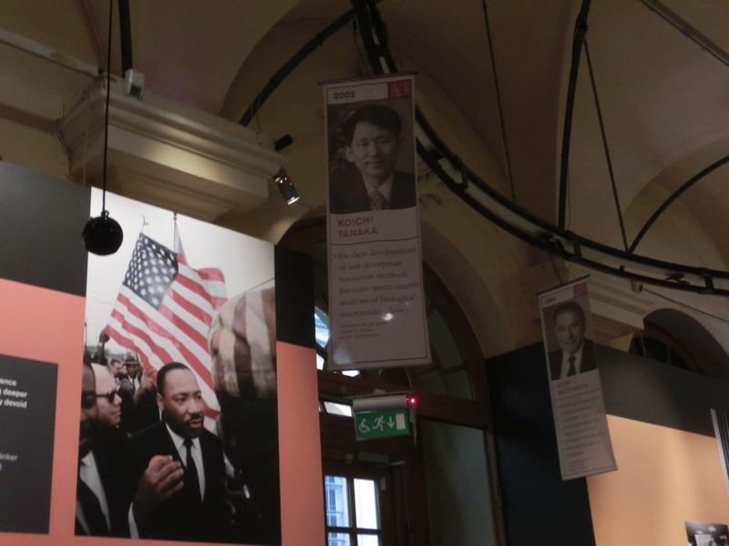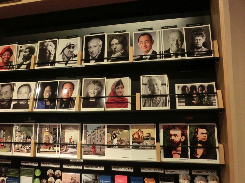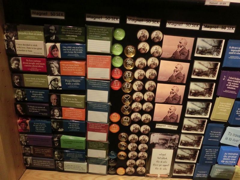 スタジアムを後にし、再びメトロへ。ストックホルム中央駅の次、ガラムスタン駅にて降りる(@45)。このあたりはいわゆる繁華街でお店がたくさんあり、多くの人がいる。そして大広場に面して建っているのが、ノーベル博物館。中に入ると、まず昨年受賞者に関する展示があった(@120)。ここ数年日本人の受賞者が続いているし、昨年受賞の本庶佑先生が紹介されているのを見るとやはり日本人として誇らしい。館内の天井には、歴代の受賞者の写真などが記載された垂れ幕がゆっくりと動いている。順番がランダムに並んでいるのでいつ日本人が出てくるかと見ていたら、川端康成と田中耕一両先生を見つけることができました。