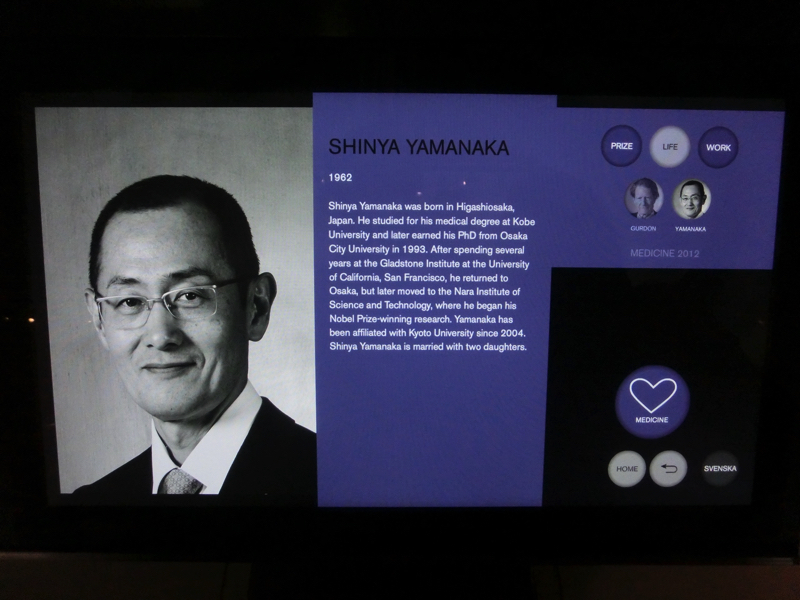 あとは企画展として、今はキング牧師関連の展示がされている。ざっと1年ほど展示されるようです。館内中央には歴代の受賞者のプロフィールや受賞内容などが年代別に自由に調べられるモニタがある。まずはやっぱり日本人を調べたいので、小学校の大先輩である山中伸弥先生から見てみよう。