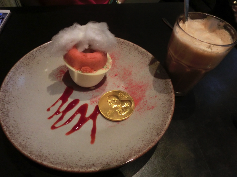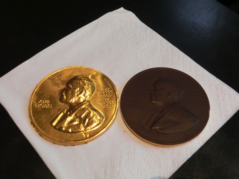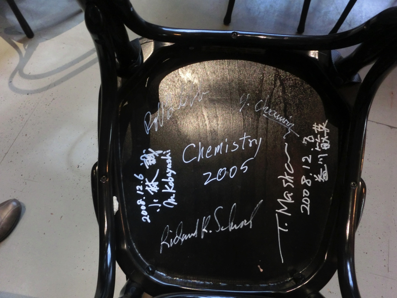 館内にはカフェもあるのでちょっと休憩。ここはノーベルアイスクリームをいただきましょう。ノーベル賞のメダル型のチョコレートが添えられていておいしいです。コーヒーとともに、ゆったりといただきましょう(185)。このカフェにある椅子の裏には、ここ最近のノーベル賞受賞者のサインがあるとのこと。座っている椅子の裏を見ると、そこには本庶佑先生のサインが。すばらしい。近くの席の椅子を裏返してみると、そこには2008年化学賞の益川敏英先生と小林誠先生、そして別の椅子には2015年物理学賞の梶田隆章先生のサインが。どこかに山中伸弥先輩のサインがあるはずだが、残念ながら見つけられず。その代わりといってはなんだけど、近くの席の人がちょうどオバマ大統領のサインを撮っていたので、せっかくなので撮らせていただきました。見所の多いノーベル博物館、堪能しました。では行きますか。