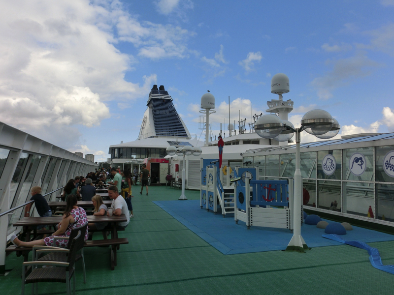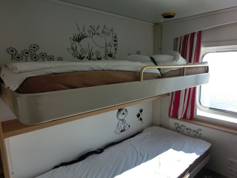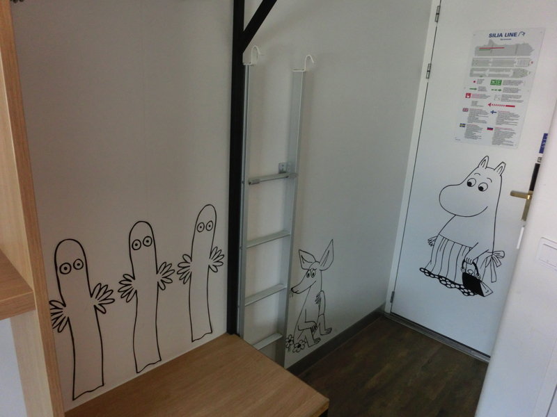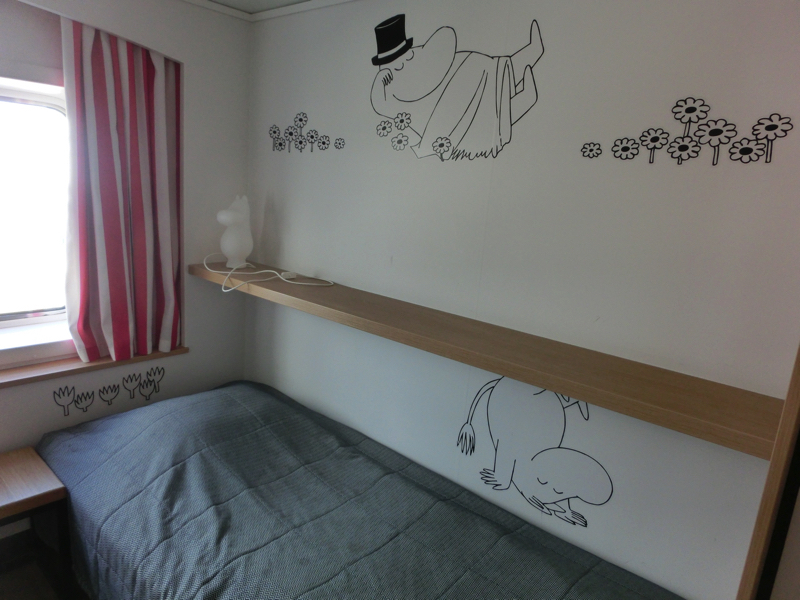 9階にある部屋へと行くと、そこはムーミン部屋。壁にはムーミンのキャラクターがいろいろ描かれている。片方が二段ベットで畳まれているが、それを開くとまた出てきた。パパママはもちろん、スナフキンもミイもニョロニョロもいるぞ。ムーミン型のランプもあるし、窓から外もみえるし、楽しい部屋ですね。さあ、出発までデッキに行きましょう。