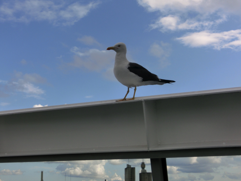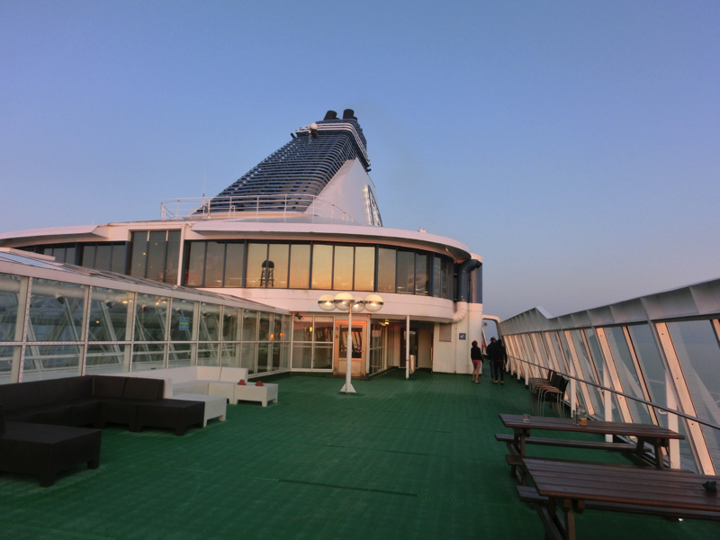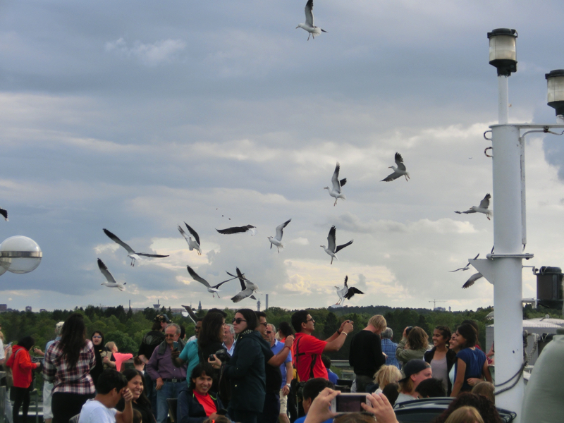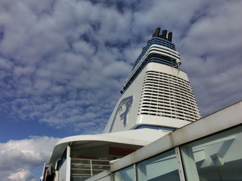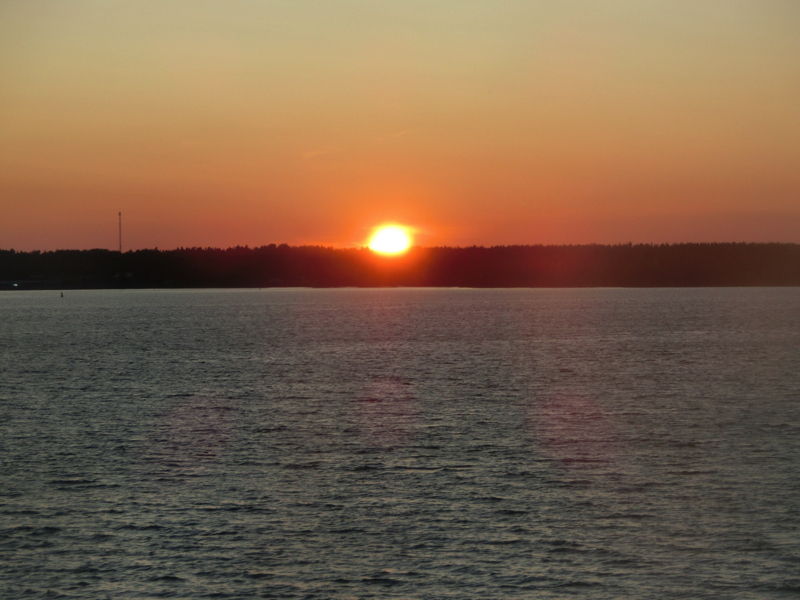 16:45の定刻となり、船は出発。しばらくデッキで景色を楽しむ。たくさんのカモメがついてくるが、これはどこまで来るんだろうね。船の左右にはずっと島が見えるが、地図を見ると、まさに無数の島がある。小さな無人島も多いが人の住む島も多く、島間の交通に車を乗せた船が行ったり来たりするのは尾道向島間と同じような感じかな。その島々の間を縫うように船は進む。海面はまるで鏡のように、ほとんど波もない。あまりに揺れないので、船に乗っていることを忘れてしまいそうだ。しばらくは船内の探検や7Fプロムナードのお店を見たりして、部屋に戻りましょう。
