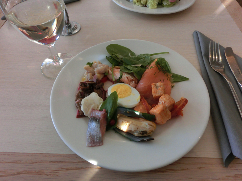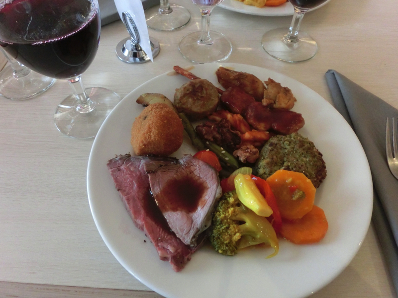 19時を過ぎた。夜ごはんは19時半からだが、多くの人で集中するだろうし多少は早く行っても問題ないでしょう。6FのGrandBuffeに行くと、すでにたくさんの人がいました。広いレストランには、たくさんのビュッフェが並んでいる。少しずつ、とにかくたくさんの種類を食べてみよう。ビールもワインも飲み放題なのでこれは危険だな。まずは冷たい系をいただくが、一度では取り切れない。ニシンだけでも何種類もあるし、肉系もラムやトナカイのハムなど変わったものもあるし。どれもおいしいです。温かい系のメインとなるのはやっぱりローストビーフかな。肉厚でおいしいです。窓からみえる景色は、穏やかな海と水平線に沈む夕日。いいですね。さて、締めにはデザート、これも何種類もあるが結構なくなっているものも多く、さっぱり系をいただきましょう。ごちそうさまでした。