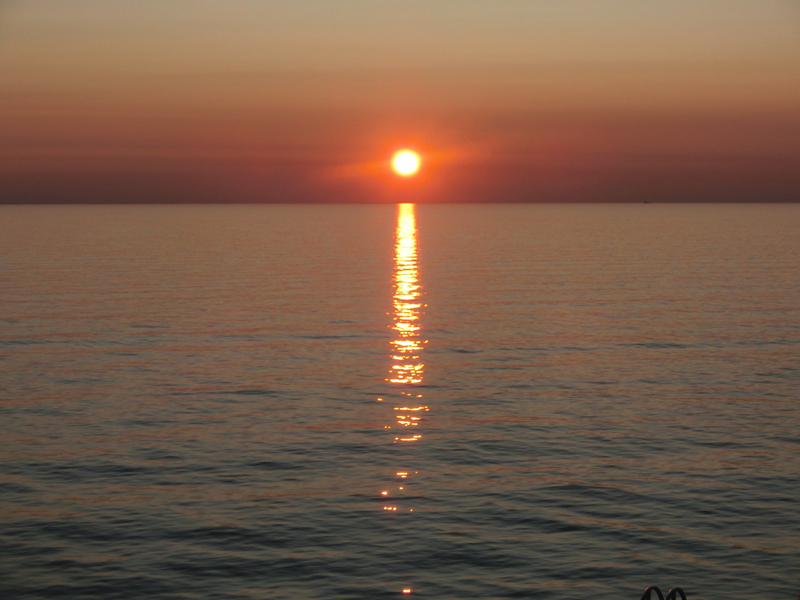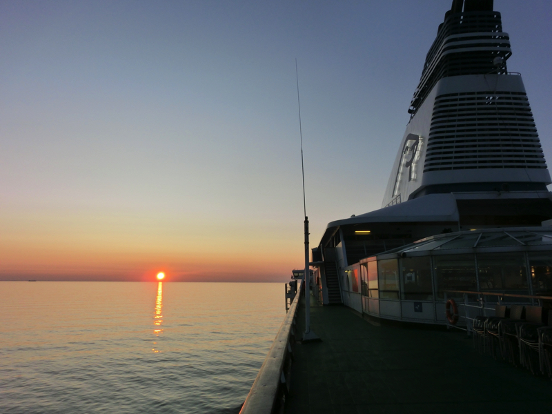 目覚めると4時半ごろ。間もなく日の出の時間なので、デッキに上がってみるとちょうど太陽が上がり始めたころ。穏やかな青い海にはオレンジ色の光の道ができている。今日もいい天気になりそうだな。それにしても、海は本当に穏やか。寝ている間も、ほとんど揺れを感じることはなかった。まあ、たくさん飲んですぐ寝たから揺れを感じている暇もなかったけどね。しばし朝日を楽しみ、部屋に戻る。船室のシャワーは狭いがそれなりにさっぱりできたかな。