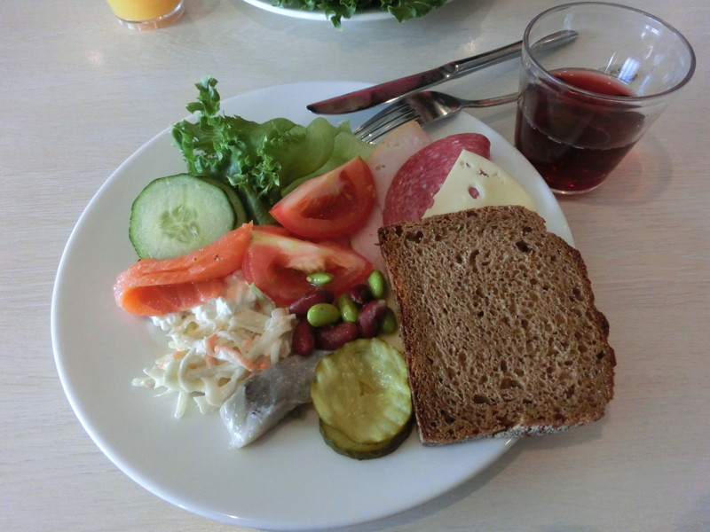 朝ごはんは一応朝7時からで、少し早めに行ったがすでに多くの人がいました。ハムやチーズ、ニシンやサーモンなどいつも通りに頂く。サーモンはおいしいがもうちょっと脂ののりが少なくてもいいかもね。温かい料理でとったマッシュポテトのパイ包みのようなのは微妙。でもいろいろちょっとづつ食べられるのはいいね。食後にはヨーグルトとコーヒーをたっぷりいただき、ごちそうさまでした。さて、では最後にお土産ショッピング。北欧デザインのTシャツなどゲットし(43.4)、部屋に戻って荷造りしましょう。