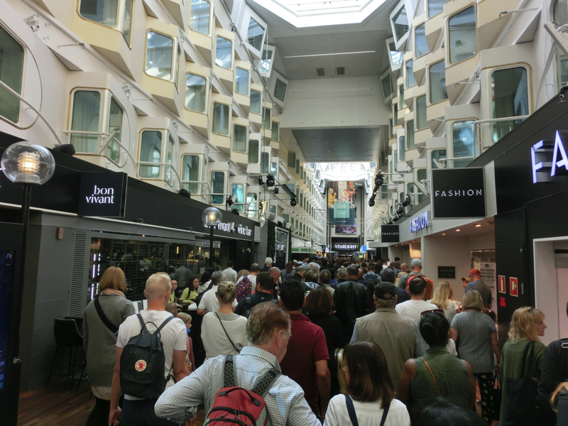 では船へと乗り込みましょう。ここからはタリン行きやリガ行きの船も出ており、大きな船が並ぶ姿は壮観だ。ヘルシンキ行きに向かうと、船の側面にムーミンとサンタクロースの絵が見え、いかにもフィンランドのイメージがいい感じ。船の入り口ではムーミンがお出迎えしてくれ、船内へ。中は巨大な吹き抜けになっており、たくさんのお店があるようだ。あとからゆっくり見るとして、まずは部屋へ。