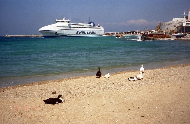 おなかがいっぱいになったので、腹ごなしに街を歩く。まだミコノスの記念品を買っていないのだ。いろいろと探した結果、街と風車をイメージした小さな置物を買うことにした(2000D)。さあ、もう11時だ。最後にペドロに会いに行く。3匹そろって寝ていたが、相変わらずたくさんの観光客に囲まれていた。港はやっぱり強風だ。ホテルに戻り、預けていた荷物を受け取り、船の出発までロビーで待たせてもらいましょう。すごく眠いが寝られないのがつらい・・・