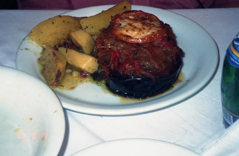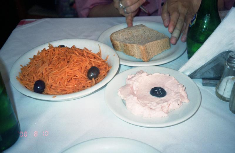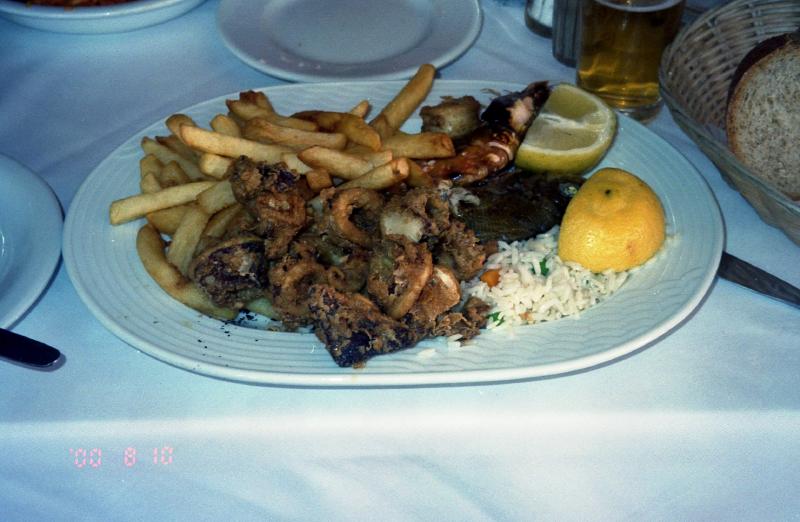 さて、お昼にしましょうか。ペドロのいるレストランにしましょう。風が強いので、中の席に着く。タラモサラダとキャロットサラダ、スタッフド茄子そしてシーフードミックスフライ。飲み物はもちろんビールとペリエ。まずはタラモサラダ。相変わらず塩辛いのだが、それは口に入れたときだけで飲み込むと塩気がすっと引く。不思議な感覚だ。パンに付けて食べるとうまい。そしてキャロットサラダ。これは見事にキャロット三昧、皿いっぱいの千切りにんじんだ。にんじんの濃い味がしてうまい。次はスタッフド茄子。焼いた茄子の上にトマトやタマネギなどが乗せてあり、これも野菜の濃い味がうまい。最後にシーフードミックスフライ。ある程度想像はしていたが、かなりのボリュームのものが出てきた。メインとなるのはイカフライ、レモンをたっぷりと絞って食べる。冷凍ではないイカの味がしておいしい。魚は日本人としてはやはりきれいにほぐして食べなければ。そしてエビ。なぜかこれだけは今ひとつだったかも。でもほとんど平らげ、満腹になりました。ごちそうさま(8350D)。