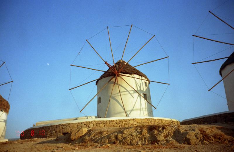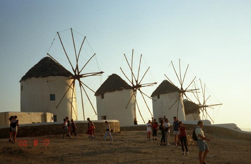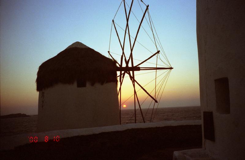 ここにも猫がいた。愛想の無い猫だが、日本の野良猫のようにすぐに逃げたりしない。かわいいものだ。さて、日没までここで待っていたいのだが、あまりにも強風のため少し近くの路地まで避難。もう少し沈むまで待っていよう。10分ほど立ち、そろそろいいかな。少しでも風をよけるため、風車越しに日没を拝むことにしよう。いよいよだ。風車の影でオレンジ色に輝いていた太陽がかけ始めた。今日も遠くの島影ははっきりとはわからない。あっという間に太陽はその姿を消してしまった。一気に暗くなり、街は一気に活気を帯びてくる。街に戻りますか。
