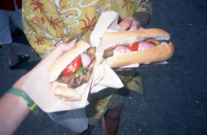 さて、港へ向かおう。現金が残り少なくなってきたので駅でキャッシングを行い(5000万TL)、準備完了。今日にお昼は昨日と同じ、サバサンド&ムール貝ピラフにしよう。サバサンドの船のまわりは相変わらず賑わっている。値段がわかっているので昨日よりもスムーズにゲットし、早速いただく。うーん、やっぱりうまい。食べにくいが、夢中になって食べてしまうおいしさだ。満足満足。続いてムール貝。昨日と同じ屋台で食べるが、今日は大きい方のムール貝にしよう(@10万TL)。うーん、スパイシー&ジューシー。うまくてうまくてたまらない。大満足。