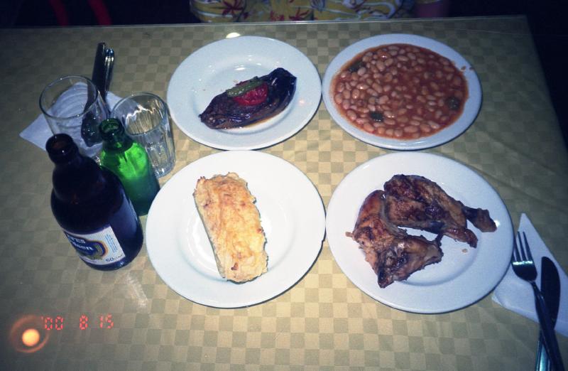 じゃあもう時間も遅いことだし、昨日と同じロカンタに行きましょう。行ってみると、そろそろ残り少なくなっている。危ないところだった。昨日と同じマッシュポテトと茄子のひき肉煮こみ、そしてチキンのグリルに白インゲンのトマト煮。いやいや、今日はよく歩きました。まずはビールとペリエで乾杯。これが今回のエーゲ海シリーズ最後の食事だ。味わって食べましょう。おなかがすいていたせいもあり、あっという間に平らげた。お店ももうほとんどのおかずが売りきれてしまったようで、片付け始めている。ごちそうさまでした(595万TL)部屋に戻る前に、公園で一休み。ブルーモスクとアヤソフィアが今日も暗闇に妖しく浮かび上がっている。