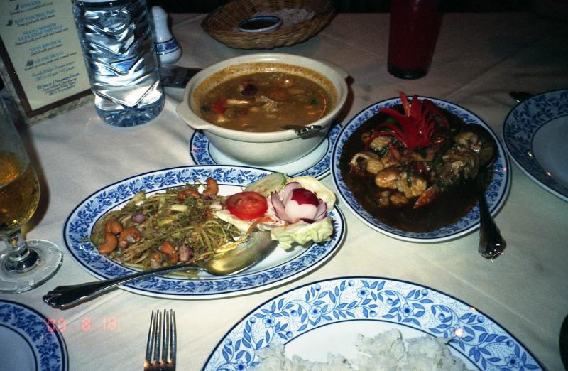 さて、18時半をまわった。20時には空港に向かうので、晩ごはんにしよう。ホテル内のタイ料理レストランへ。オープンしたばかりで、まだ客は誰もいなかった。さて、最後のごはんだ。何を食べようか。青パパイヤのサラダ、アヒル肉のレッドカレー、シーフードのチリ炒め、そしてもちろんビール、そしてスイカのフレッシュジュース。最初にエビせんのようなおつまみが出てくる。これが妙においしく、ばくばくと食べてしまう。エビせんがなくなったころ、料理が3品とも同時に出てきた。ますはシーフード炒め。辛いぞ。コクのあるチリソースと新鮮な魚介類、辛いがとてもおいしい。このソースだけでもごはんがたくさん食べられそうだ。