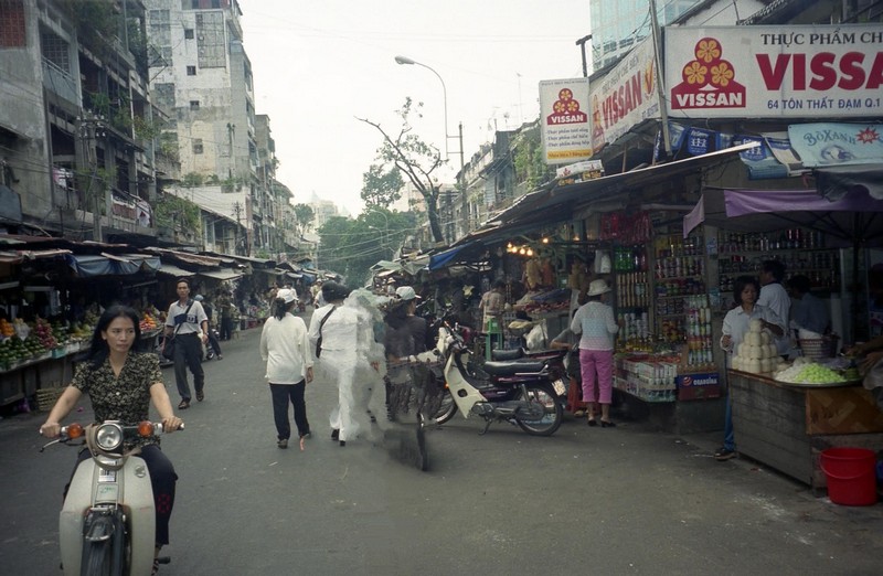 食事が終わり、入国手続きの用紙が配られた。ビザの申請からそうなのだが、「招聘者」を記入する欄があり、通常個人では手配できないためにビザは旅行会社を通じてとるようにガイドブックには乗っている。ところが実際は、特に記入しなくても直接領事館でビザをとることができた。入国手続き用紙にも「招聘者」記入欄がある。本当に空白でいいのだろうか?書きようがないのだが、一抹の不安が残る。飛行機は徐々に高度を下げ、12時30分ごろ、ホーチミンのタンソンニャット国際空港に到着した。入国手続きに向かう。さて、どうなるか・・・ろくに見もしない。何の問題も無くスタンプが押され、無事ベトナム入国が完了した。税関を抜け、いよいよベトナム・・・なんだこれは!空港の出口には制服をきた無数のタクシードライバーが到着客を待ち構えている。異様な光景だ。とりあえず両替(100$→1.405,600ドン)すると札束だ。財布が異様にふくれてしまった。タクシードライバーがよってくる。10$で市内まで、というドライバーを無視し、とにかくメーターで行ってもらうように言うが、結局6ドルで行くことになった。まあメーターで変に遠回りされてもいやだし、まあいいかと思う。タクシーは空港を離れ、街へと向かう。道にはたくさんのバイク、自転車。ベトナムのイメージどおりの風景だ。道沿いの建物にはパステル系のペイントが多く、タイやマレーシアとはまた異なった雰囲気だ。