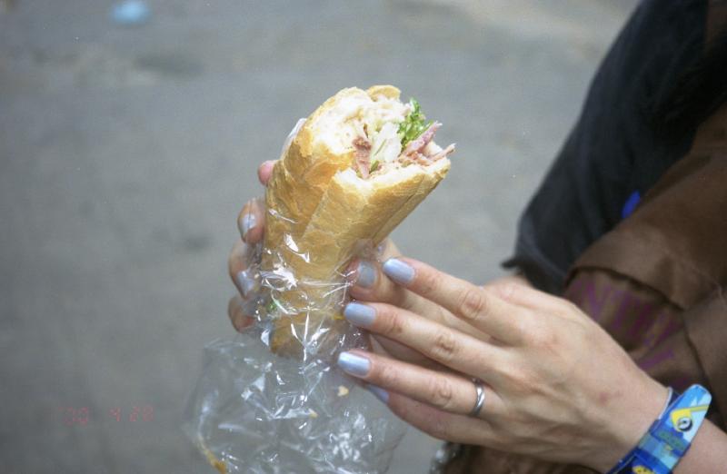 そうか、このあたりにくるといろいろとあるな。目指すパンやさん到着。わりとにぎわっている。早速目指すバイン・ミーをゲットし、歩きながらほおばる(7000ドン)。なんというのだろうか、パリで食べるサンドイッチとはまったく違う。レバーペーストや香草が挟まれており、ニョクマムの風味がある。なかなかうまい。いろんなお店や屋台で食べてみよう。道沿いにはフォーを売るお店、バイン・ミーの屋台、なんだかわからないがおいしそうなものを売っている屋台など、いろいろとある。