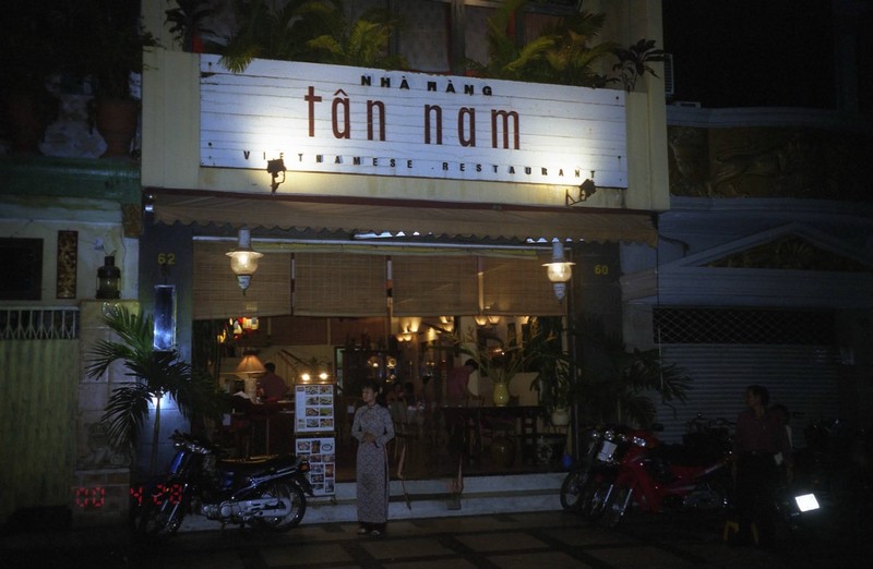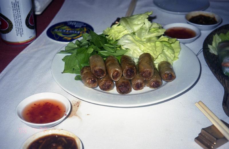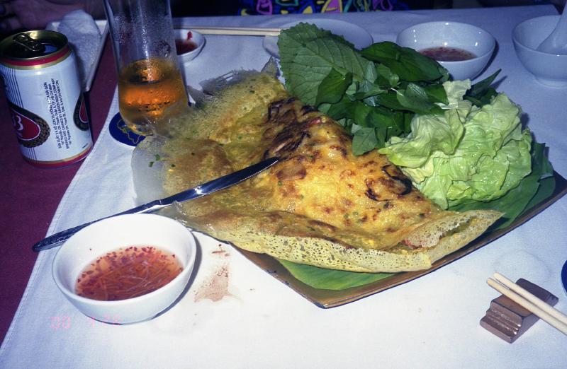 カフェの目の前にある雑貨やさんにまず入る。陶器やお箸など、きれいなものがたくさんあるが、買いたいと思うものは特に無かった。このドンコイ通りには雑貨やシルクのお店など、いろいろとある。次に入った雑貨やさんは小さいお店だが、ベトナムチックなコーヒーミルがあった。候補だな。次に陶器やさんに入る。青や緑の陶器がいいのだが、ちょっと重いかなあ。まあ考えてみよう。通りを歩いて気がついたのだが、バインミーの屋台がいくつか出ている。昼間はぜんぜん出ていなかったのに。そうか、やはりあまり暑いときは出ないんだ。さてさて、今日の晩ご飯はどうしようか。さっきガイドブックでみた中で、このあたりにある2軒見に行く。そうだなあ、どっちにするか。うろうろしているうちにおなかが減ってきたので、ごはんにしますか。結局オープンエアの「タン・ナム」に入ることにした。まだ時間が早いのだろう、誰も入っていない。さて、まずはビール。ベトナムの333というビールを頼む。そしてゴイ・クン、チャオ・ゾー、バイン・セオの典型的ベトナム料理に鶏肉の炊き込みご飯を注文した。さっそくビールがでてきた。乾杯!あー、のどにしみわたる。まずはゴイ・クンが出てきた。日本で食べるものよりも周りの皮がパリっとしており、手でつまんで食べることができる。しっかりとした食感で、これはうまい。香草がすごく効いている。日本で食べるのとはまったく違う、本場の味わいだ。まあこれだけ香草が効いていればすき嫌いも分かれるとは思うが。続いてチャオ・ゾー。これもうまい。パリパリとした食感でビールが進むぜ。これも皿いっぱいのたっぷりの香草とともに食べる。さらにバイン・セオ。これでもか、とばかりに香草がいっしょについてくる。回りが香ばしくておいしい。野菜たっぷりだ。ベトナムで太った人を見かけないが、これだけ野菜をとっていれば太りようが無いのだろう。最後に鶏肉の炊き込みご飯。何というのだろう、ショウガがきいていておいしい。ちょっと頼みすぎたかと思ったが、食欲をそそる風味でどんどん食べる。結局ほとんど平らげてしまった。ふー満足。これだけ食べて全部で225,000D。1800円ほどだ。安いねえ。