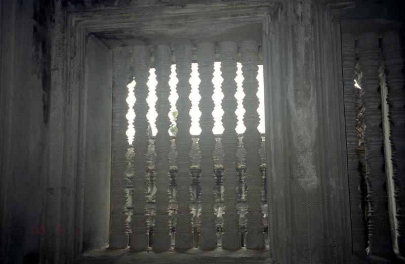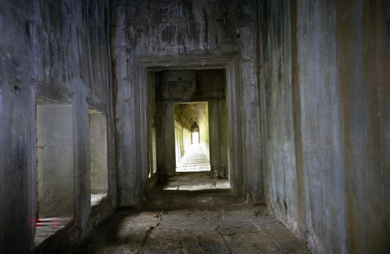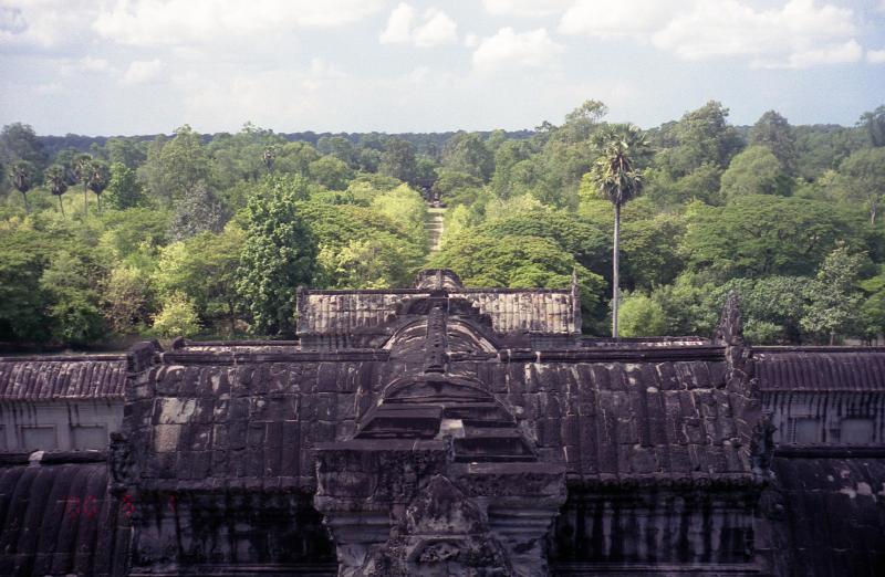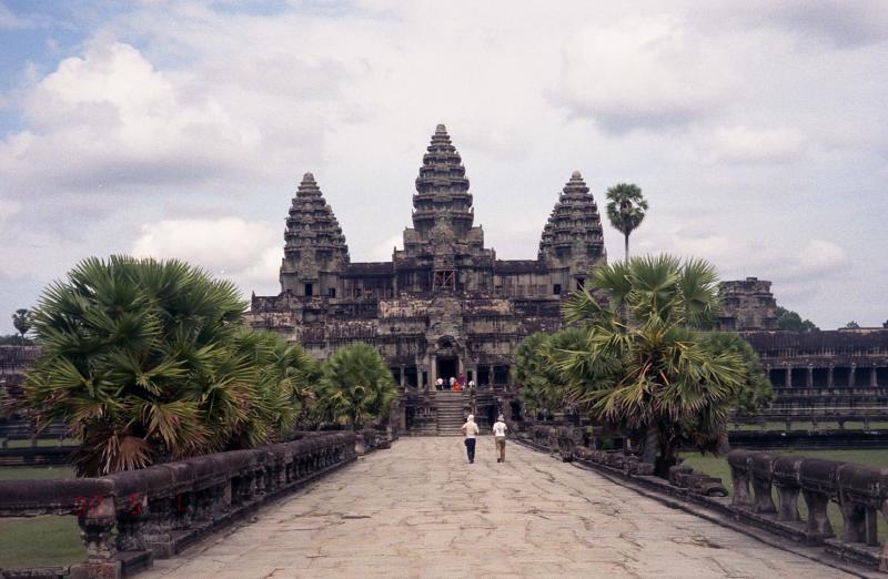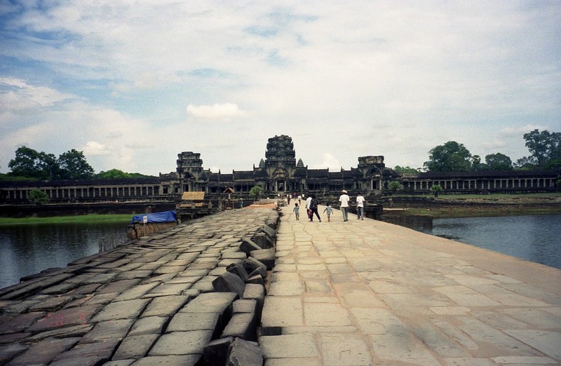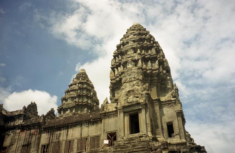 さあ、次はカンボジアだ!出発ロビーに向かう途中、女性2人組に声をかけられた。しばらく話しているうちに、シェムリアップについたら街までタクシーをシェアしましょう、ということになった。話をきいてみると、かなり旅なれているようだ。1時間ほど経ち、搭乗の時間となった。バスで飛行機まで向かう。シェムリアップ行きの飛行機は、2-2の少し小型の飛行機だ。7割ほど埋まっているだろうか。すぐに飛行機は離陸した。シェムリアップまでは1時間20分ほどだ。サンドイッチの簡単な機内食が出た。割とおいしかった。1時間ほど飛んだだろうか、飛行機は広大な湖、トレンサップ湖にさしかかった。かなり大きな湖で、はるか遠くに水平線が広がっている。飛行機は徐々に高度を下げている。窓からは森が広がっているのが見える。そんな中に、遺跡がいくつか見えている。12時45分、シェムリアップ国際空港に到着した。ずいぶんと小さな空港だ。入国審査の手前に、ビザの申請カウンターがある。そこでビザ申請用紙を受け取るのだが、なぜか用紙代としてひとり1ドルとられる。いったい何のお金なんだ?そしてビザ代にひとり20ドル。ビザはあっさりと発行された。さてこれでカンボジア入国。先ほどの2人組とおちあい、タクシーで街まで行こうとしたが・・・たくさんのタクシードライバーが押し寄せてくる。みな街まで1ドルとか、ホテルの名前とか、叫びながらよってきて腕をつかんで自分の車につれていこうとする。わけがわからない。ホーチミンのほうがまだ秩序があった。ここはみながわれ先にとよってくるのでわけがわからない。結局、空港のポリスらしき人の案内であるタクシーに乗ることになったが、それが本当に良かったのかどうかはわからない。例の2人組とは、目的のホテルが違うこともあってとてもじゃないがいっしょに行ける状態ではない。2人組もどうやら別のタクシーにつれこまれたようだ。お達者で・・・タクシーは街まで2ドルで行くという。そして道すがら、アンコールワットまで今日一日回ると行ってきた。ましな車だし、10ドルで行くという。相場としては丸一日で20ドル位らしいので、半日で10ドル、まあいいだろう。15分くらいでホテル、タ・プロームに到着。さっそくチェックインし、部屋に入る。なかなか立派なホテルだ。やっと一息つける。あの空港は、毎日あんな状態なのだろうか・・・すこしだけ休憩し、さあ、アンコールワットへ行こう!ロビーに降りるとさっきの運ちゃんが待っていた。出発だ!シェムリアップの街を抜け、しばらく行くとアンコールワットの入場料を払う料金所があった。どうも今日オープンした新しい料金所らしく、妙に新しい。ここで一人20ドル払う。その後ガバメント・タックスということで一人2ドルとられた。うーん、ビザの申請用紙といい、どこまでが本当なのかがわからない。でも明確に拒否する根拠も無いので払うしか無いのだが・・・そこから5分ほど走ると堀のようなところにぶつかり、車は左折した。そのとき、その堀の向こうがわに、森の中から頭を出しているアンコールワットの姿が見えた。おおーっ。アンコールワットの正門は西側に面しており、そこへ向かう参道の前で車はとまった。さあ、いよいよだ。車を降り、十段ほどの階段をあがると 西門へとつながるまっすぐな参道の向こうにワットの尖塔が二つ見えている。ゆっくりと歩きだす。すると、尖塔がだんだんと姿を消し始め、参道の中央あたりで完全に見えなくなってしまった。さらに歩き進み、西塔門前に到着。ここを抜けるとアンコールワットの全容が見えるのだ。期待が膨らむ。階段を登ると、暗い門の入り口から まるで額に入った一枚の写真のように中央祠堂が見える。これは計算されたものなのだろうか。そしてその写真に向かって歩き、門をくぐりぬけた。突然、アンコールワットの全体像が目の前に広がった。