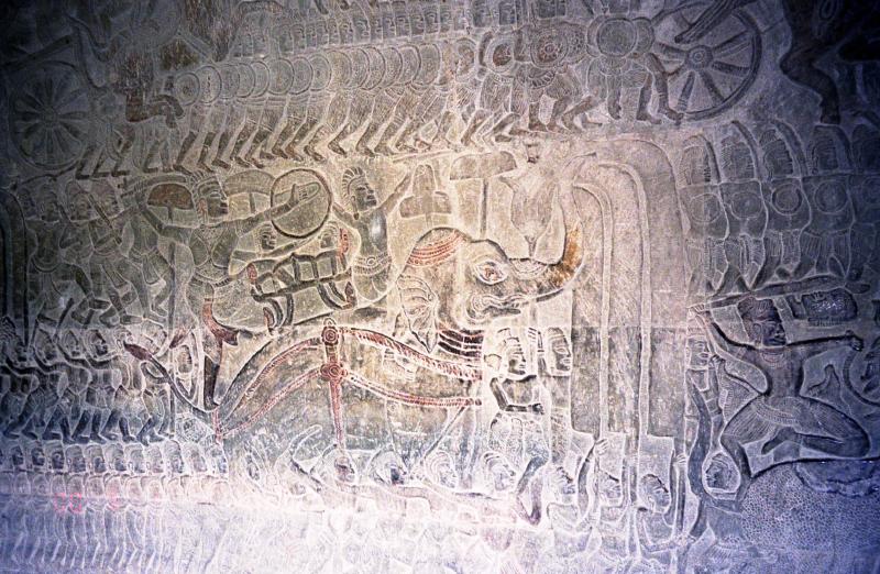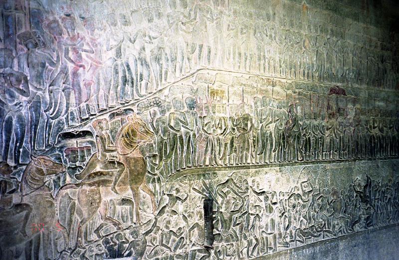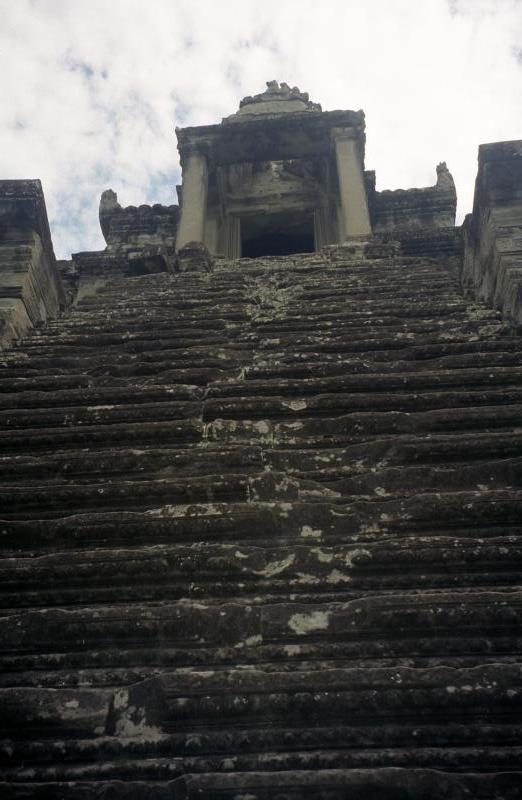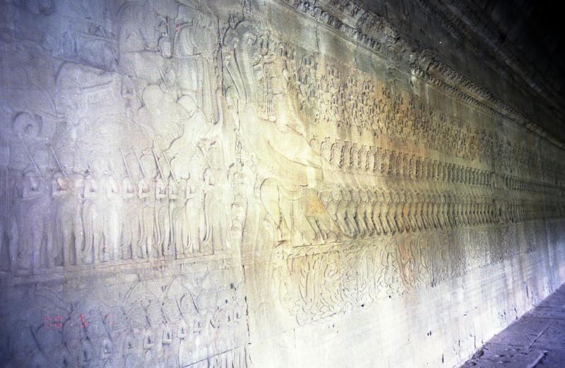 すばらしい。まっすぐ伸びる道の向こうに空に向かってそびえたつ3つの尖塔。酷暑の空気と、セミの声が響く静寂。一瞬、軽いめまいを感じ、自分がまっすぐ立っているのかわからなくなった。800年以上もの時を全身に感じる。重い。うつろなまま、歩き始める。ふと、地元の少年の声でわれに帰った。改めて周りを見渡してみる。計算し尽くされた空間に身をおくという、妙な居心地の良さを感じる。参道の途中には階段がある。その階段の目の前に立つと、アンコールワットは再び姿を消した。しっかりと、わずか十段ほどの階段を登る。すると再度偉容が目の前に広がった。いよいよ回廊の内側へと入る。日陰に入っても暑い。薄暗い中、急な階段をあがるとようやく塔のところまで来た。ん?ひょっとしてこの斜面を登るのか?塔の回りは段になっているので、確かに登ることはできるのだろうが、ものすごく急だ。でもほかにそれらしき階段も無いし、塔の上には人の気配がするし、おそらくここを登るのだろう。その前に、回廊のレリーフを見ることにしよう。