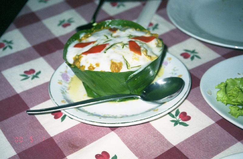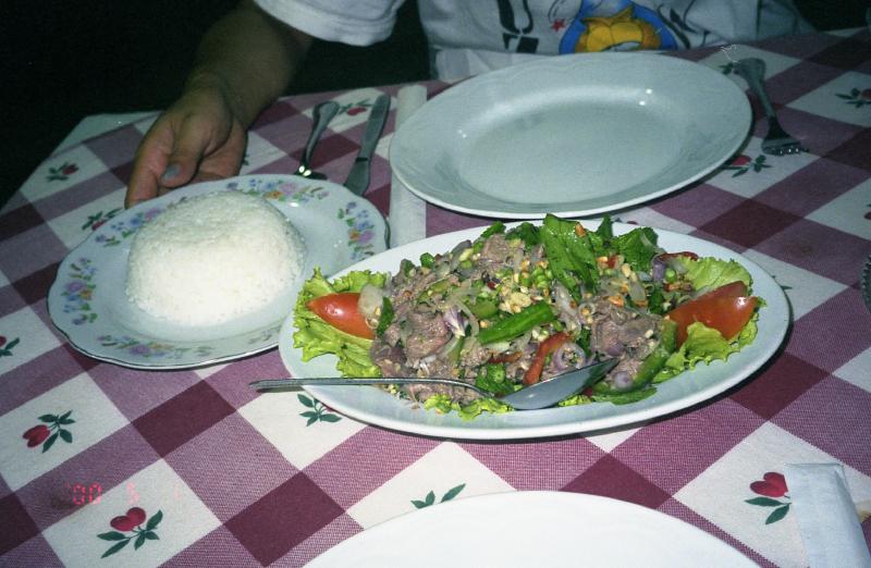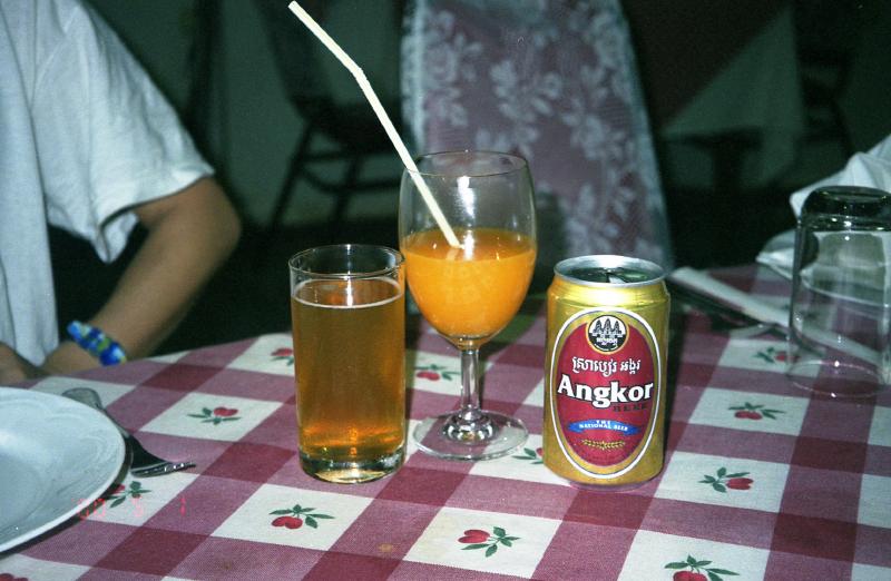 はー。それにしても暑い。カンボジアの今は暑気という、一年でもっとも暑い時期だ。本当はっもっとほかの遺跡も見てみたいのだが、あまりにも暑いし、疲れた。あまり体調がよくないこともあり、無理は禁物だ。ここまでにしよう。その代わり、アンコールワットをじっくりと堪能することにしよう。参道を戻りがてら、何度も振り返り名残を惜しむ。西塔門まで戻ってきた。これでアンコールワットとはおさらばだ。さよなら!またくる機会があるだろうか。でもバンコクから簡単に飛べるので、そう遠い場所では無い。ただあの空港のタクシードライバーと戦わなければならないが・・・出口には、そのタクシードライバーが待っていた。ほかに行こうかと誘ってくれるがちょっともう限界だ。4時過ぎだし、いったんホテルに戻ろう。10分くらいでホテルについたので空港からの2ドルとアンコールまでの10ドル、しめて12ドルを払い、明日の空港までの送迎を5ドルで約束し、部屋に戻った。涼しい。この街は大きなホテルやカフェが無いので暑さからの逃げ場が無いのだ。こんな暑い日はシェスタに限る。晩ごはんまでひと眠りしましょう・・・あー気持ち良かった。さあて、晩ごはんだ。ホテルで食べるのも何なので、ちょっと外へ行きましょう。ガイドブックに乗っているレストランの中で、比較的近くにあるお店にしましょう。ホテルを出ると、外は真っ暗だ。街灯があるにはあるがあまり明るくない。足元に気をつけながら歩く。でも通り沿いにぽつりぽつりとオープンカフェやレストランがあり、それなりににぎわっているようだ。目指すレストランに到着。本当はもう少し先にもレストランがあり、そこと比べようかと思っていたが、先の道もまた暗いのでやめた。この店にしましょう。店に入ると10テーブルほどあるうち3つのテーブルが埋まっていたが、 なんとみんな日本人。こんなカンボジアの片田舎にも、日本人はたくさんきているのだなあ。さて、とりあえずビール。もちろんカンボジアのビールを飲みましょう。アンコールと言うそのビールは、鮮やかな金色をしている。飲んでみる。アルコールがきついわけではないが、とても濃い味がする。まるでポートワインのビール版のような、濃い深い味わいだ。料理ができるのを待っていると、ふとお店のBGMが日本語なのに気づいた。「上を向いて歩こう」など坂本九特集だ。それが終わると次は「すばる」。谷村新司が続く。お店の雰囲気はふた昔前のレストランのようだし、客は日本人ばっかりだし、テレビはいつのまにかNHKになっているし。ここはいったいどこなのだ?さあて、ようやく料理が運ばれてきたぞ。まずは「ニョアム・プリア・サッコー」牛肉と細切り野菜のサラダ。いろんな野菜が入っている。歯ごたえがあり、さっぱりした味付けでおいしい。ベトナムから感じていることだが、牛肉がとてもおいしいのだ。続いて「アモック」ココナツジュースで甘酸っぱく煮込んだ魚だ。トレンサップ湖で取れた魚だろう。一見カレーのようだが辛くは無い。とても淡白でおいしい。カンボジア料理はタイ料理のように辛くは無いのだ。今日一日の疲れを癒すように、ゆっくりと食事を楽しむ。これだけ食べて10ドル、おなか一杯だ。超満足です。