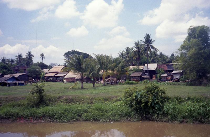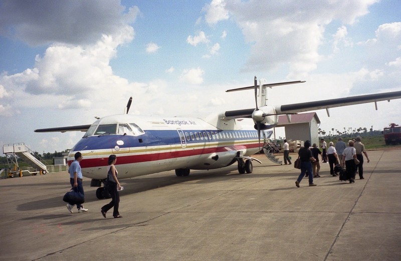 これで9ドルちょっと。10ドル払っておつりが5000リエル。カンボジアのお札だ。ようし、これでマーケットでビールを買うか。店先に缶のジュースやビールをつんでいるお店があったので、そこで昨日飲んだANKORとBAYONを買いたい。値段を聞くと、ANKORが3500リエル、BAYONが3000リエル。それでは足りないが、こちらの物価が良くわからない。値切ってみたらなんとか5000リエルで2つとも買うことができた。果たして本当のところはいくらなんだろう。ビール2缶で1ドルしないわけだから、日本人的にはむちゃくちゃ安いのだが・・・さて、13時をまわった。ホテルに帰ろう。13時半にタクシーがくることになっているので、ロビーで待つ。涼しくていい。5分ほど早く、運ちゃん登場。でも昨日の運ちゃんとは違うぞ。でもフロントの人もこれでいいって言ってるし、いいんだろう。タクシーに乗りこみ、出発!あっという間のシェムリアップだったが、アンコールワットに行くことができて本当に良かった。今度はもうちょっと暑さがましなときに来たいな。タクシーは街を抜け、シポソン行きのまっすぐな道を走る。ここをずっと行けばポイペト、アランヤプラテートそしてバンコクまで行くことができる。そんな陸路な旅もしたいが、時間が無いとできないか。空港に近づいたとき、ベトナム航空が離陸していくのが見えた。昨日乗ってきた便の帰り便だ。さあ空港に到着だ。昨日到着ロビー前にあれほどいたタクシーの運ちゃんが、今日はいない。飛行機が着くときにだけ集まってくるのだろう。タクシーをおりたら運ちゃんがごにょごにょ言いだした。何でも昨日の運ちゃんに10ドルって聞いたとかなんとか。そうは問屋がおろさない。「ノー、5ダラー」で5ドル渡し、それで完了。空港は一応国際空港なのだが、1時間に一本も無いのだろう、小さな空港だ。何もすることが無いので早速チェックインし、出国手続きをする。出国税とやらで一人8ドル。うーん、生活費は安いのにビザやら出国税やらでお金がかさむ。仕方ないけれど。空港の待合室は冷房の無い、蒸し暑い部屋だ。ほかにも十数人が飛行機を待っている。そのうち日本人が数名いた。搭乗まで1時間ほどあるのだが、この暑さでは何もする気が起きない。暑い〜早く飛行機に乗せてくれ〜ちょっとうとうとしながら待っていると、ようやく搭乗の時間になった。飛行機までは100メートルほどしかないのだが、バスに乗って向かう。