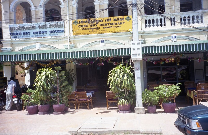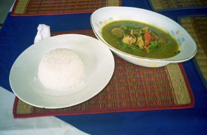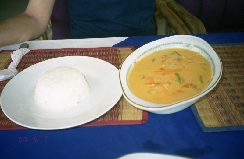 買い物ができてひと安心だ。休憩したいな。カンボジアに来たら「かぼちゃのプリン」を食べようと思っていたのだが、どうしても見つからない。うーん。今日は空港に向けてホテルを13時半に出ることになっているので、ちょっと早いがお昼にしましょうか。マーケットを越えたところにレストランが並んでいる。さて、どこにしようか。せっかくなのでカンボジア料理を食べたい。いくつかお店のメニューをみて、「KHUMER CUISINE」と書いてある店に入りましょう。席につき、ほっと一息。それにしても暑いところだ。さっきの買い物のときも、生地を見ているだけなのに汗だくになってしまう。とにかく、まずビール。昨日とは違うビールを頼む。きたぞきたぞ。かんぱーい!もう味がどうこういうよりも、とにかくのど越しだ。うまいうまい。一息ついたところで改めて味わってみると、昨日のビールよりは軽い感じで、よくある外国のビールと言う感じ。料理は牛肉と野菜のスープ、鶏肉のカレー。ともにごはんといっしょに出てきた。牛肉のスープはこれは何のスパイスを使っているんだろうか、独特の深い味がする。とにかくおいしい。カレーはココナツミルクが入っているようで、ぜんぜん辛くない。具の中にはカボチャと思われる野菜が入っている。日本のカボチャだったらカレーの中にとけてしまうだろうが、ここのカボチャはしっかりとした歯ごたえを残している。暑くてそれほど食欲があるわけではない中、完食しました。