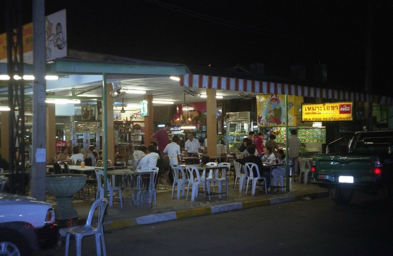 8時起床。なんだか体がだるい。ちょっと疲れたかな。本当はタイの屋台朝ごはんにしたいところだが、食欲が無い。とりあえずシャワーを浴び、ちょっとゆっくりし、とっとと空港に向かうことに。タクシーが楽だがお金も無いし、やっぱりバスにしますか。大通りに出てバスを待つ。59番のバスを待つのだが、なかなかこない。203番はいやというほど来るのに・・・でも15分ほどでバスが来た。まあまあラッキーかな。後ろの席が空いていた。さあて、また1時間以上かかるのだろう。まあゆっくり行きましょう、と思ったが後ろの席はすごくゆれる。おまけに道の段差のせいでときどき体が大きく浮き上がる。なんてこったい。なんとか耐えるしかないね。昨日ほど渋滞はしていないが、結構混んでいる。バンコクって本当にいつも混んでいるんだな。1時間くらいたっただろうか、ようやく空港エリアに近づいてきたようだ。確か国内線は国際線よりも手前にあったはず。と、窓越しに国内線ターミナルの文字が見えた。ようやく着いたよ。バスを降り、ターミナルへ。あー疲れた。国内線だけのターミナルなのに、ずいぶんと立派なビルでたくさんの人がいる。出発まではあと50分くらいなので急いでチェックイン。出発ロビーへと向かう。ようやく落ち着いた。なんだか体がとてもだるい。やはりバス移動はきつかったか・・・食欲も無い。どうしたことだ。と、飛行機への搭乗時間になった。バスに乗って飛行機へ。バスは空港の中をかなり走る。広い空港だ。チェンマイ行きの飛行機はジャンボ機だ。バンコク―チェンマイ線はタイ最大の国内線なのであろう。空席が目立つ機内だが、運の悪いことに後ろに中国系のおっちゃんおばちゃん集団が座った。やつらのうるさいことうるさいこと。なんでそんなに大声でしゃべるのだ。体のだるさにこたえる。飛行時間は1時間弱だろうが、ずっと後ろは騒がしかった・・・さあ、チェンマイ到着。バンコクに比べると、ずいぶんとこじんまりした街に見える。心なしかすごしやすく感じる。北にあるし、標高もあるしでバンコクとはかなり温度が違うのだろう。今日の泊まりは予約済みのプラザホテル。空港を出ると、ちょうど迎えのシャトルバスが来ていた。なんだかリッチな気分。ホテルまでは10分ほど、バンコクのような渋滞も無ければ大きな道も無い。ホテルについてちょっとびっくり。予想した以上の大きな立派なホテルだった。チェックインして部屋へ。やっと一息。ああだるい。食欲もあまり無い。とにかく横になりたい。うう、わずか一泊のためのカオサン往復は失敗だった。こんなことなら昨日あのままチェンマイまで飛んでしまえばよかった。後悔先に立たずだが・・・とにかく今は体調が戻るまで、ゆっくりしましょう。テレビをつけるとNHKの衛星放送がやっている。バスジャックって?日本はえらいことになっているようだ。とにかく寝ましょう・・・少し暗くなったころ、目がさめた。テレビはいまだにバスジャックを映しつづけている。いったいどうなっているのだろうか。しばらくテレビを見ていると、寝たせいもあって体が少し楽になってきた。それに腹が減ってきたぞ。じゃあ飯にしますか。ホテルを出て少し歩くと、ナイトマーケットにでた。チェンマイのナイトマーケットはかなり規模が大きいらしい。アクセサリーやTシャツ、置物やかばんなど、いろんな店が出ている。そんな中に何軒か屋台が出ている。しばらく歩いていると少し広場のようなところに出た。その周りにはレストランというよりも食堂が何軒かある。一通り見渡し、そんな中からわりとお客さんの入っているお店に入った。うん、体が戻ってきたようだ。ビールを飲みたくなっている。とりあえずビール!シンハビールでのどを潤す。さてさて、注文しましょう。鶏肉のにんにく炒め、青菜の炒めもの、そしてトムヤンクンを食べましょう。炒めものはどっちもビールにぴったりだ。でも今日はちょっと控えめに、ビールは一本だけにしておこう。トムヤンクンが来た。このからすっぱいスープがうまい。