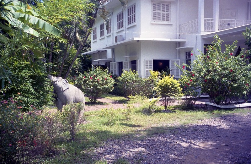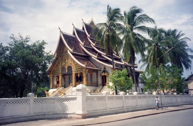 さて、高度を上げていくラオス航空だが、別に霧は出ないぞ。ちょっと期待はずれなほど、まったく何の問題も無く飛行機は飛んでいく。機内食が出た。はじめてみた、機内食でのパスタ、しかもミートソース。麺はさすがに伸びきっており、給食の記憶を思い起こさせる。食べるには食べたが、あまりおいしくなかった。1時間たつかたたないかのうちに、飛行機はもう高度を下げ始めている。窓から見下ろす景色は、まるで「まんが日本昔話」のようだ。丘の斜面に段々畑が作られている。無事着陸しタラップを降りると、空港のバスが待っている。すぐにバスは出発した。あれれ、どこへ行くんだ?バスは舗装されていない道を抜け、さらに空港から出てしまった。学校帰りの小学生が歩いている道をバスは行く。このままバスを飛び降りたら密入国完了だな。しばらくすると管制塔らしきものが見えてきて、そのそばの空港ビルに到着。まずはビザの申請。写真1枚と30ドル。今回の旅行は、空港利用税とビザ代がかなりかかっているな。無事に入国完了。とりあえず20ドル両替(150,000キップ)。さあて、ホテルまでどうやっていくんだ?シェムリアップならばいやというほどタクシーの運転手が群がってきたが、ここは誰もよってこない。タクシーの運転手らしき人はいるのでその人に近づくと、どうやらその通りだ。ホテルまで2人で20,000キップということだが、ほとんど情報が無い状態できているので相場がさっぱりわからない。まあいいいか。タクシー、というよりワゴン車は田舎道を抜け、15分ほどでHOTEL SOUVANNAPOUUNに到着した。このホテルは日本から電話で予約をしておいたのだが、ちゃんと取れていた。よかったよかった。ホテルは白塗りの壁でいたるところに大理石が使われており、なかなか立派なホテルだ。