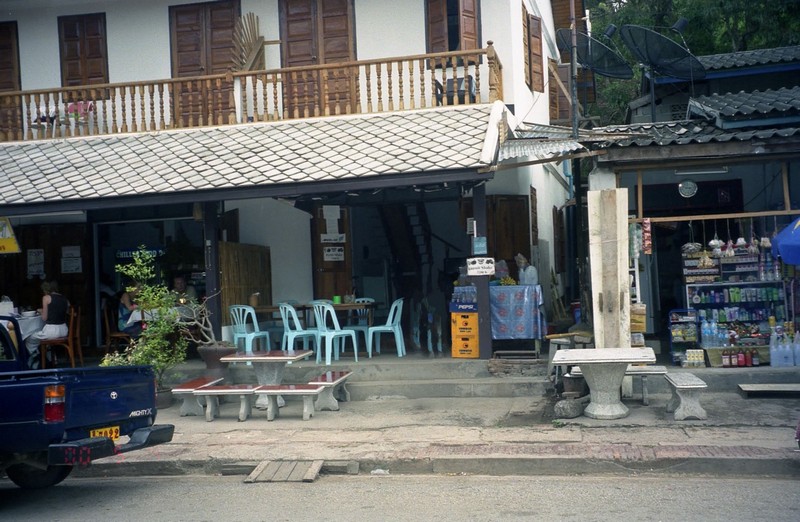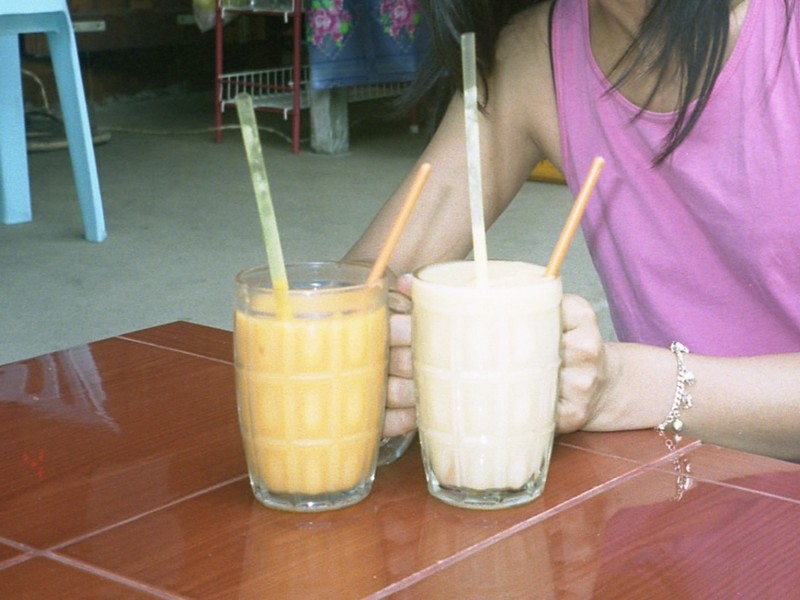 部屋で少し休憩し、街歩きに出発だ。まずはメインストリートを目指そう。といってもわずか300メートルあるかないかの一本道に、いくつかのお店やレストランが並んでいるだけなのだが。お店を見て歩きたいが、とりあえずフルーツシェイク屋で栄養補給。この通り沿いにはなぜかフルーツシェイク屋がたくさんあり、一杯2000キップ。それぞれパイナップルと、マンゴーを選ぶ。見ていると、ココナツミルクのパウダーと、シロップのようなものを少し入れている。あれが隠し味か?さあて、ジョッキに一杯のシェイクが出てきたぞ。どれどれ。ストローで吸うには少し力がいるぞ。すごくコクがあっておいしい。ココナツミルクがポイントだろうか、深い甘味と果物そのものの甘味がミックスされて、とてもおいしい。