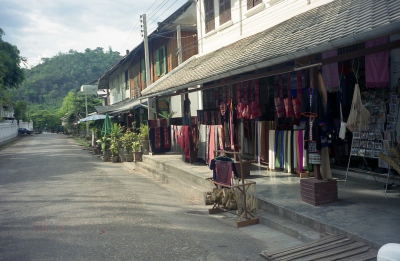 さあて、元気が出てきた。道沿いには雑貨を売る店が何軒かあるので、順番に見て回る。まずは手漉きの紙で作ったノートをお土産用に買おう。まずは最初のお店で3冊ゲット。15,000キップを12,000キップに。一冊55円ってことですか。次に見たお店で一回り小さいけれど色合いの違うノートがあったので3冊ゲットしよう。と、店番のおばあちゃんに値段を聞くと、英語どころか電卓も扱えない様子。おばあちゃんはいったん隣の店に行ってしまい、電卓に「15,000」の数字を押してもらって戻ってきた。さっきより小さなノートだからさっきよりは安くしてもらわないとと思い、「10,000」と電卓をたたくとおばあちゃんはものすごく困った表情をしている。ありゃりゃ、これはちょっとしのびないぞ。あまりに値切るのはなんだか人でなしになるような気がしてきた。結局さっきのお店と同じ、12,000キップで買うことになった。うーん、買い物をするときは調子良くても元気な店員のいる店にしよう。向かいのお店も見てみよう。同じノートがあって値札が「3500」。やられた・・・ここでも3冊、買いました。さて、次はTシャツがほしいぞ。ラオビアのTシャツがほしいのでさっきから見ているのだが、Tシャツというよりもポロシャツのような生地でしかも弱そうなのが多い。でも何軒か見ていく中で、一軒だけわりとしっかりとした生地のTシャツを見つけた。22,000キップと言われたのを18,000キップでゲット。よしよし。