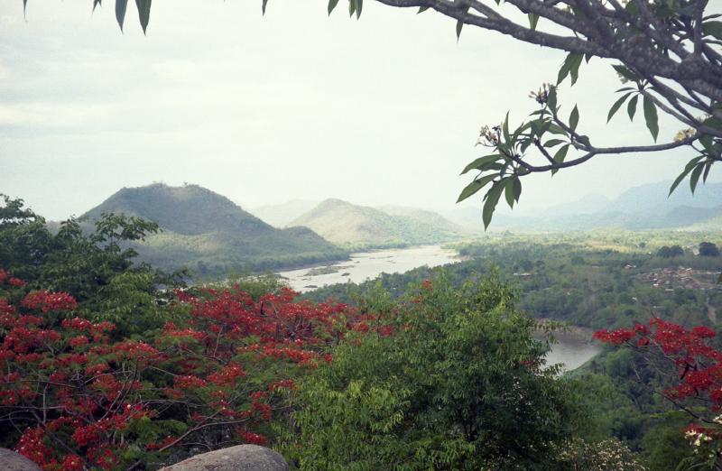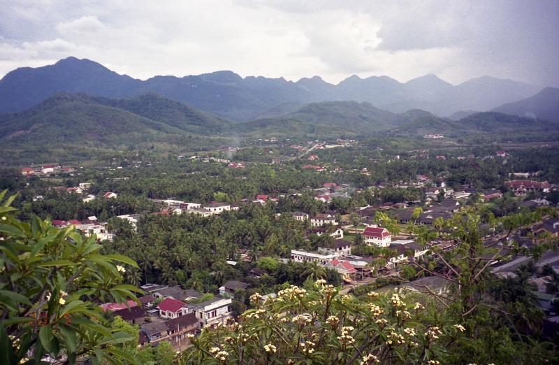 まだ136段目。なんでも600段ほどあるらしい。とにかく登り始める。途中からはペースをつかんだのか、少し楽になった。なんとか頂上到着。いい景色だ。メコン川が見下ろせる。緑の多い村だ。しばらく景色を楽しんでいると、空からエンジン音が聞こえてきた。見るとちょうどラオス航空が滑走路にむけて着陸をするところだった。ビエンチャンから来たのだろうか、そのプロペラ機はすべるように着陸した。地元の高校生だろうか、頂上ではしゃぎまくっている。目が合うとにっこり微笑んでくれる。それにしてもラオスの人たちはすごく人なつっこい笑顔を投げかけてくれる。なんだかすごくいい気分だ。