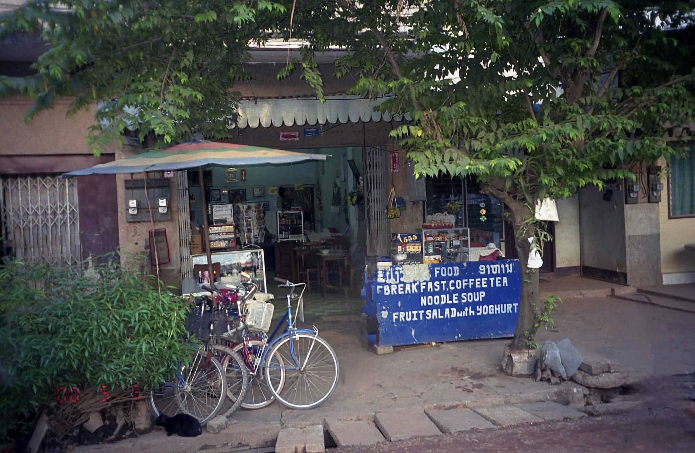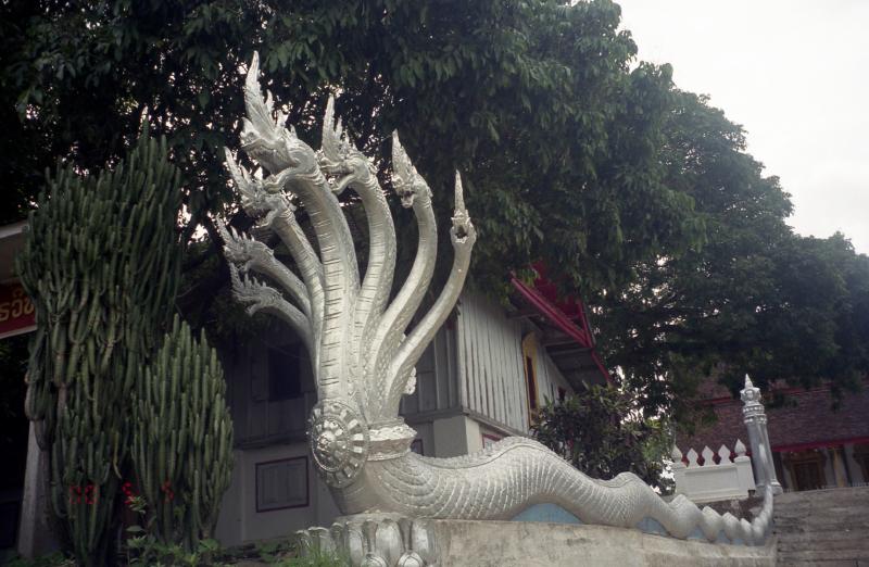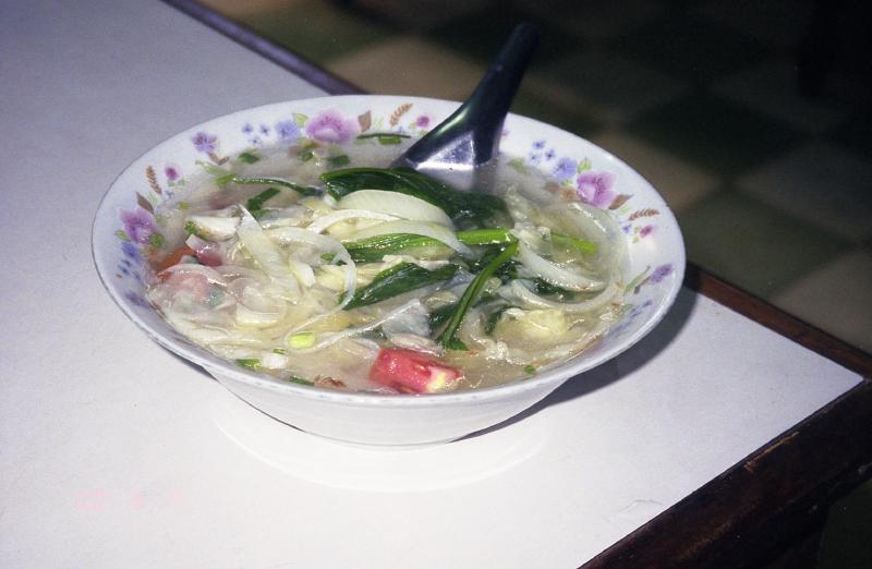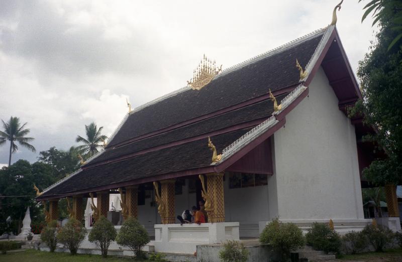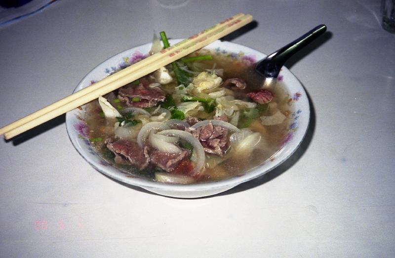 出発ロビーはわりとにぎわっている。日本人もちらほらといる。しばらくして、搭乗の時間になったようだ。バスに乗って飛行機に向かう。到着のときと同じように、バスはいったん空港から外に出た。そして背の高い草むらを分けいるように細い道を入り、飛行機のそばに来た。山あいにある滑走路だけしかないような空港に低い雲。妙に絵になる景色だ。さあ、出発だ。席は半分くらい埋まっているだろうか。離陸するとあっという間に人里を離れ、山の上を飛んでいた。わずか50分の国内線なので、ドリンクサービスがあるのみ。窓から見える景色はずっと緑だ。その緑はビエンチャンに着陸する直前まで続いた。飛行機は無事にビエンチャン到着。空港ターミナルはずいぶんと古いビルだ。荷物を受け取りさて、どうしますか。街までは25,000キップとタクシー乗り場に書いてある。でもこの荷物を持ってうろうろするのはつらい。夜のバンコク行きにチェックインできてしまえば一番楽なのだが。ところで国際線はどこだ?空港の外に出て周りを見渡してみると妙に新しい立派な建物がすぐ横にある。あれじゃないか?と、近づいてみるとその通り。空港の入り口の看板を見るとこのビルができたのが98年、そして作ったのは日本だ。中に入ると、なんとなく関空ような雰囲気がある。バンコク行きは20時。今はまだ16時前なので、さすがにチェックインはできない。荷物預けも無いようだ。さて、どうしようか・・・そうだ、ラオス航空のオフィスがある。中にいたおじさんに事情を話すと、預かってくれることになった。ありがとう!さて、タクシーに乗りましょう。でも国際線の入り口前には街までの値段が書いていない。その辺にいたタクシーの運ちゃんに聞いてみる。10ドルだって?75,000キップ、3倍のぼったくりではないか。で、国内線の出口に25,000キップと書いてあったことを言うと、おう、しまった、というような表情でその運ちゃんは別の運ちゃんを呼んだ。 何だろう、運ちゃんの力関係だろうか。とにかくその運ちゃんは25,000キップで行ってくれるようなのでOKだ。タクシーが空港を出ると、すぐに人の生活がある道だ。たくさんの車やバイクが行きかっている。一応舗装はされているのだが、土ぼこりが舞い上がっている。10分ほどで、マーケットに到着。とりあえずは腹が減ったので、麺を食べたい。しばらくマーケットの周りや中をうろうろするが、どうも食べ物を出す店が無い。しかももう店じまいを始めているお店も多い。ありゃりゃ、このマーケットは夕方までなのか?結局何も見つからなかった。仕方が無い、メコン川に向かって少し歩こうか。と思ったものの、自分がどこにいるのかが良くわからない。ビエンチャンの情報はほとんど何も無い。あるのは空港でもらったホテルのパンフレットに乗っている小さな地図だけだ。でもなんとか近くにいた人に聞きながら、川の方角と自分のいる道がわかったのでひと安心。とにかく歩きましょう。時間は5時を回ったところで日差しがきつい。そんな中に土ぼこりが立ち登る。歩いているとすごく疲れてくる。一歩一歩がだんだん重くなってきた。18時からチェックインが始まるので、その頃には空港に戻らなければ行けない。なんとかしてラオス最後のごはんを食べたいのだが・・・探すと無いものだ。ちゃんとしたレストランはいくつかあるのだが、それは違う。もっと庶民的な、安い麺類を食べたいのだ。15分ほど歩くが見つからない。時間が過ぎて行く。仕方が無い、疲れたし空港に戻るか。でもちょっと入ったあの通りだけ見ておきますか・・・安食堂発見!お望みの麺類もあるようだ。ラッキーだ。中に入り、野菜の麺と牛肉の麺を注文。来るまでの間、冷たい水を買ってのどを潤す。あーよかった。さあ、出てきたぞ。スープの透き通った、具だくさんの麺だ。さっぱりとしたスープがおいしい。ラオス締めの麺をじっくりと味わって食べた。ごちそうさまでした。