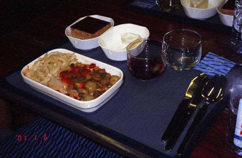これでフランスともまた、しばらくのお別れ。次はもっとフランス語をみがいてこよう。ロンドンから乗ったときは昼間だったので外の景色も楽しめたが、今は夜なので何も見えない。ドリンクサービスが始まった。やっぱりシャンパンで乾杯。まだ終わった訳ではないが、あっと言う間に過ぎ去ったこの旅を振り返ってみる。一番の思い出と言えばやはり、モン・サンミッシェルではないだろうか。パリからはそう遠い訳ではないのだが、交通の便の悪さからこれまで断念してきた。ようやく今回、ロンドンとパリプラス田舎町を一つという中で、サン・マロを選択したことで、ようやく行くことができたのだ。料理のサービスが始まった。前菜はアンティチョークのサラダ。ブルゴーニュの明るい赤によく合う。そしてメインは鶏肉と魚からのチョイス。それぞれ選択し、どっちもおいしいよ。デザートはチョコレートたっぷりのケーキ。一口目はおいしかったが、ちょっと甘すぎ。全部は食べられませんでした。ふー、おなかいっぱい。