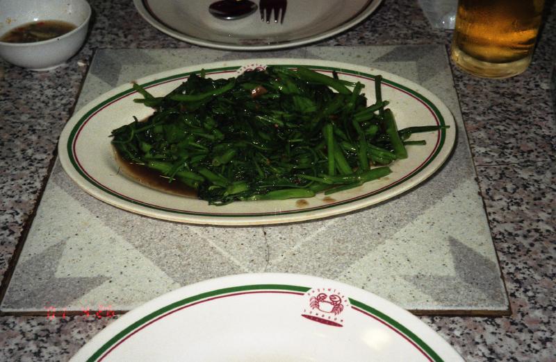 さあ、元気いっぱい、晩ごはんだ。どこにいこうか。ガイドブックを調べた結果、ソンブーンというシーフードレストランに決めた。さあ、出発。もうすっかり日は落ちているが、外はやっぱり暑い。レストランまでは10分ほど。入り口には新鮮なカニが並び、水槽にはエビや魚が泳いでいる。かなりにぎわっているようだし、良さそうだ。入りましょう。窓際の2人用席に案内される。さあ、何にしよう。ここのメニューは写真が載っているのでわかりやすい。まずはビール、当然シンハビール。そして空芯菜のオイスターソース炒めと渡りガニのチリソース炒めを頼む。まずはビールで乾杯。ノドにしみわたる。しばらくすると空芯菜炒めが出てきた。ビタミン補給にもなるし、なによりこれがうまいのだ。ビールのいいアテになる。そしてカニのチリソース。卵と炒めているので、スクランブルエッグの様になったところを食べてみる・・・うまい。そして辛い。これはいいぞ。ビールも進むが、ご飯も進む。カニをからごと炒めているので食べにくいのではあるが、身をほじくり出して食べる。うまいうまい。夢中でカニにしゃぶりつき、ビールを飲み、ご飯を食べる。幸せだ。食べ終わるのに結構時間がかかったと思うが、アッという間に食べ終わったようだ。満腹だが、デザートにココナツアイス。アジアはデザートがこぶりなので嬉しい。欧米ではあまりデザートは食べないのだが。このアイスもココナツの実がそのままはいっており、とても美味しい。大満足です。これで450Bくらい。安い安い。