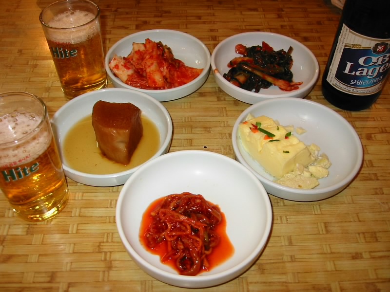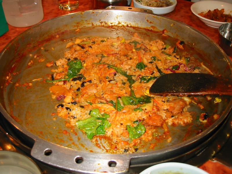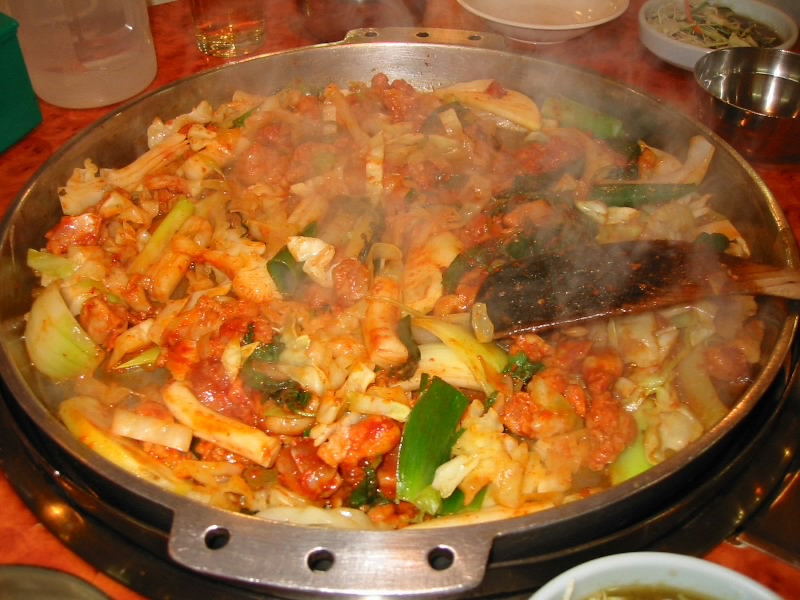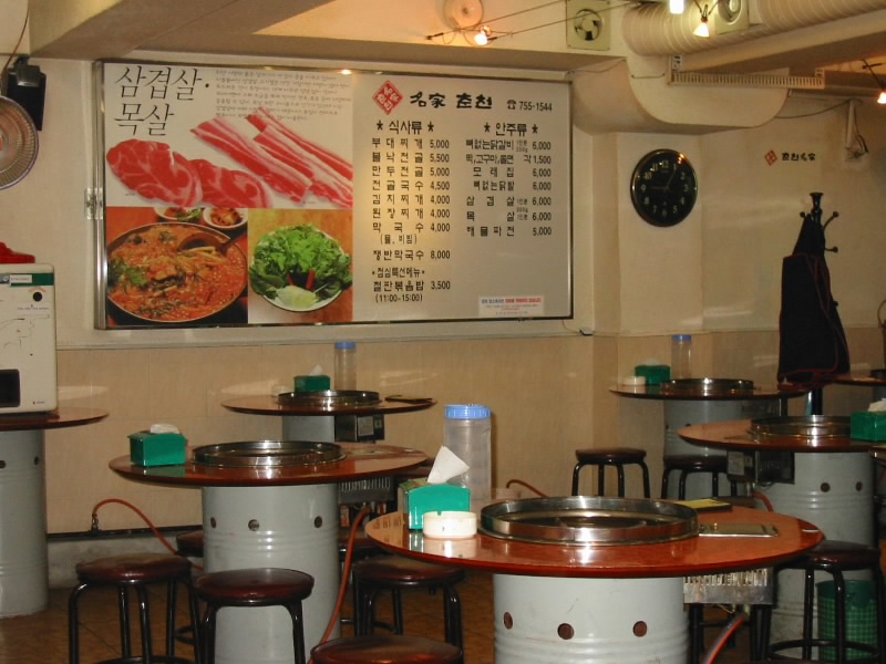ソウル到着後、ホテルは明洞のロイヤルホテルにチェックイン。まずは晩ごはんということで、近くにあるダッカルビ(鳥カルビ)やさんに入る。最初はキャベツ、エゴマ、ジャガイモにトク(韓国餅)そして赤いソースをまとった鳥肉が冷たい鉄鍋の上にあるのだが、それがお店のおねえさんの手によって目の前で徐々に一体化していく。そして数分後、完全に一体化したダッカルビが完成だ。辛味と旨味、野菜と肉とトクが混然一体となり、実にビールがよく進む。おいしい・・・一通り食べた後は、シメのごはんタイム。鍋に少し残った辛いソースと具、そして白いごはんを一体化させれば、これまた辛味と旨味の幸せタイム。大満足。 |