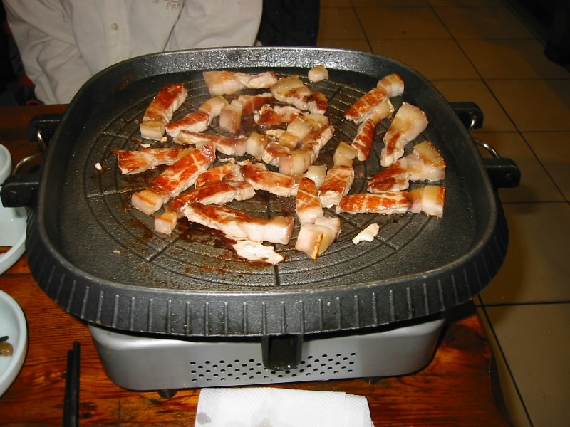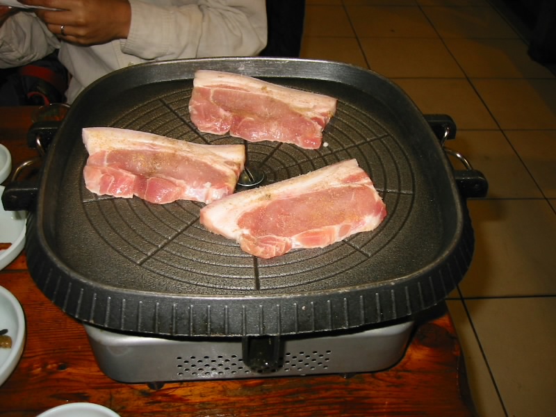 カルビもいいが、あっさりと済州島の黒豚などもおつなもの。火が通るにつれて、おいしい脂が少しずつ流れ出てくる。キツネ色に焼きあがった豚肉はシンプルでなかなかの美味。キムチとともにサンチュでくるんで食べてもまた美味。おすすめ。 |