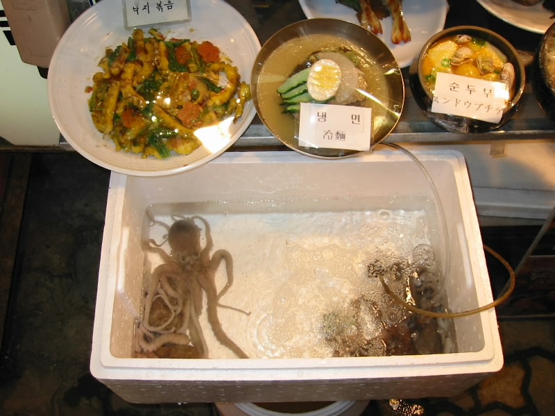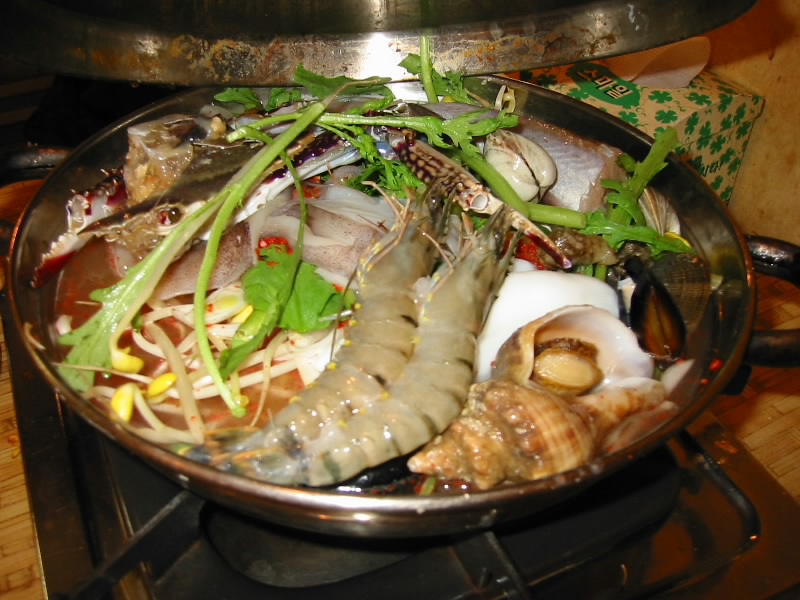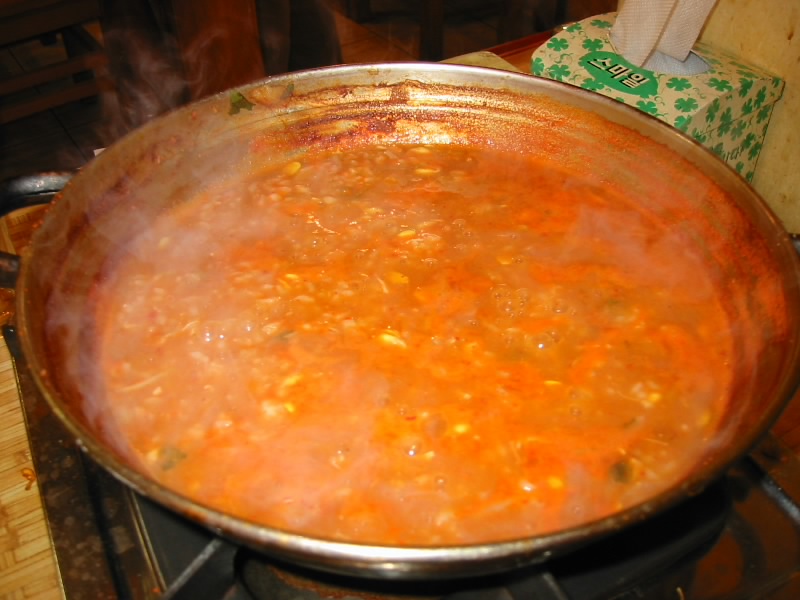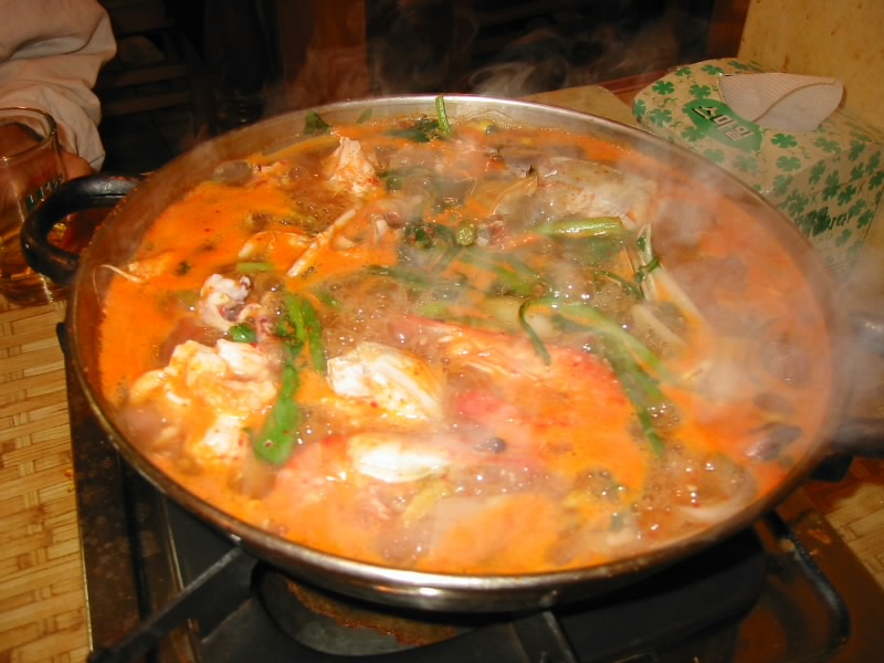 明洞にある超有名な海鮮料理屋、オモニチプ。いかにも日本人が多いお店だが。ゆったりと海鮮鍋が楽しめる。エビ、カニ、イカ、貝、サカナなどいろいろ入っていて、最初は生だった具材が赤いスープと一体化していくのがよく分かる。火が通った頃に、おばさんがハサミで食べやすい大きさに切ってくれる。辛くて、旨くて、ビールも進むね。一通り食べ終わったら、もちろん最後は雑炊で。体の芯から温まるね。 |