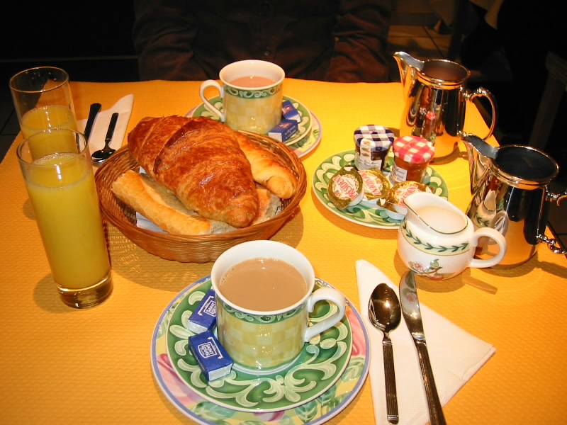 われわれは今日はどうしようか。とにかくまず朝ごはんなのだが外は雨だし、今日はホテルで食べることにしよう。一階におりてレストランへ。明るくてなかなかきれいな場所だ。オレンジジュースにクロワッサン、細身のフランスパン、それとカフェオレ、さーちゃんはショコラ。どれもなかなかおいしい。ゆったりとした朝ごはんで、エネルギー補給はばっちりだ。今日の天気を見る限り、あまり郊外にでる気持ちにはなれない。かといって人混みに行くのもいやだし・・・もう買い物をしてしまおうか。もともとは最終日にいろいろと買い出そうと思っていたのだが、荷造りや時間の余裕を考えると、重くなるが今日買ってしまったほうがいいのかも知れない。