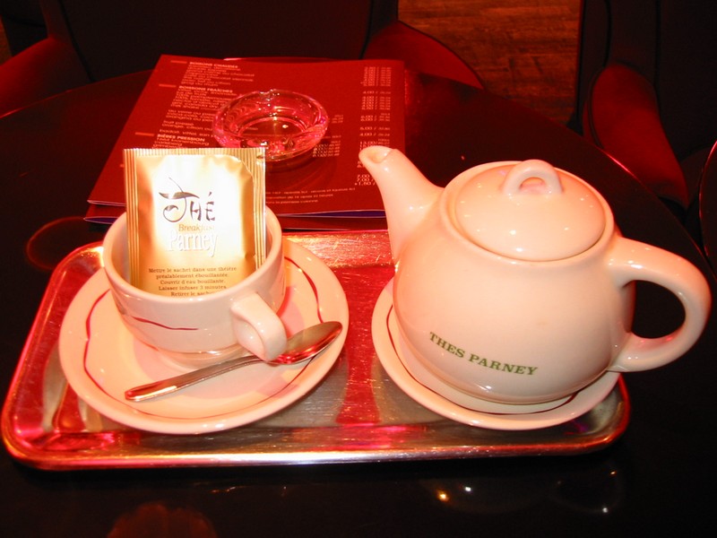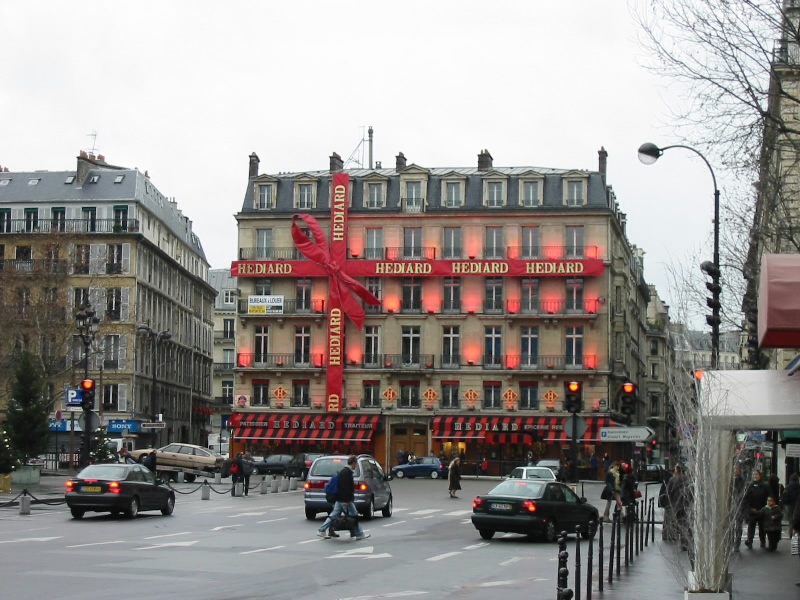 寒くなってきたな。そろそろサロンドテに行きましょうか。目的の場所はOdeonあたりなので、メトロに乗ろうと駅まで行く。そして地下へ続く階段を降りようとすると、なんとそこは人・人・人。1号線は昨日も混んでいたが、今日はそれ以上に混んでいるのだろうか。いくら何でも地下鉄構内でこの列を延々と待つのは辛いし、何よりも危ない。Odeonに行くためにはChatletまで、二駅なので歩きましょう。リヴォリ通りをシャンゼリゼとは逆方向に歩く。この通りも賑やかだ。やっぱり年末で観光客も増えているのだろう。20分ほどで、Chatletに到着。さっきの列に並んでいたらおそらくまだ電車にも乗れていないであろう。ここからOdeonまではほんの3駅。思ったよりも混んではいたが、無事到着。地上に出てみると、ここもかなりの人がいる。映画館が多く、開場を待っている人が多いのだ。ハリーポッターも上映されており、かなり人気のようだ。さて、このエリアには何軒かのサロンドテがある。今日は日曜日だが、これだけ人が出ているのであいているだろう・・・甘かった。すべてクローズ。カフェはあいているが、サロンドテは一軒もあいていない。とはいえちょっとお茶はしたい。もはやカフェでもいいのだが、どの店もめちゃくちゃ混んでいる。せっかく人混みをさけて来たのに、また人混みにはまってしまったようだ。せっかくなのでゆっくりしたいので、少し離れますか。サンジェルマンまで歩くが、途中にあるカフェはすべて混んでいるか閉まっているかのどちらか。うーん極端だなあ。もう少し行って見よう。サンジェルマンの駅を越えたあたりにようやくカフェを発見。やっているし、それほど混み合ってはいない。ここにしましょう。紅茶を頼み、ようやくほっと一息だ。サロンドテではないのでティーバックの紅茶だが、これで十分。よかった、ここまできて。しばらくのんびりと過ごす。食べることばかりのような気もするが、晩ごはんはどうしましょうか。さすがにさっきソーセージを食べたので、まだそんなにおなかは減っていないしあまりワインを飲む気分ではない。軽くパスタを食べられればちょうどいいんだけどね。そうだ、Bon Marcheに行こう。今日も疲れたし、寿司でも買って部屋でのんびり食べることにしよう。