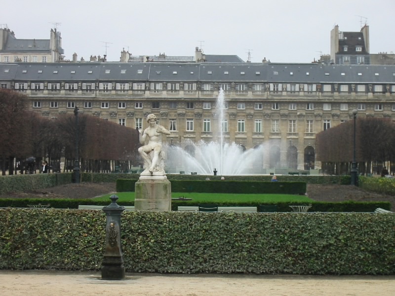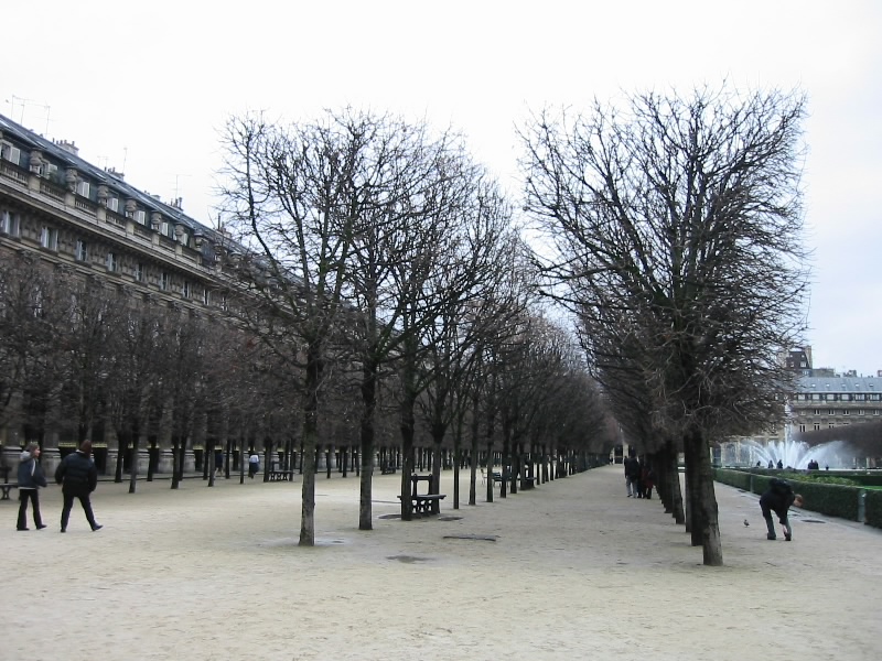 食後の散歩にパレロワイヤルへ行こう。日本料理屋の多くある通りをぬけ、しばらく行って道を曲がると突然パレロワイヤルに到着した。ここパレロワイヤルは太陽王ルイ14世が子供時代をすごしたところで、成人後は弟のフィリップに譲ったところだ。庭園をひとまわりしよう。冬枯れの木立がきれいに切りそろえられており、いい感じだ。