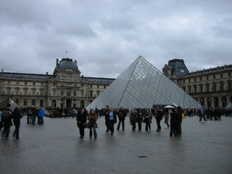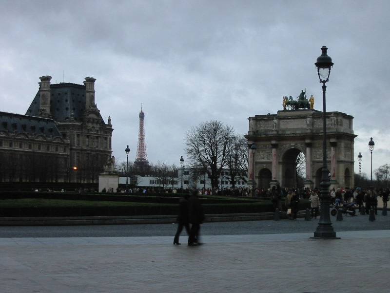 クリスマス市をでると、目の前にはルーブル宮が。ちょうどそのさきにガラスのピラミッドが見えたので、まあせっかくだしルーブル美術館の前まで行きましょうか。途中、美術館内の彫像が良く見える場所があった。ちょうどいいので写真を撮る。ピラミッド前まで行くと、たくさんの人が列をつくっていた。もう夕方だが、まだまだ入りたい人がいるのだろう。しばらくその広場でくつろぐ。寒いが心地好い。ここからはルーブル宮の一部とエッフェル塔、そしてカルーゼルの凱旋門を同時に見ることができる。これもまた、パリらしい景色。いいね、パリ。世界中から毎年何百万人もの観光客を集めるだけあって、何げない景色にも魅力があふれている。