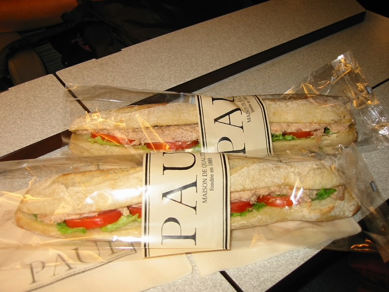 今日も7時起床。毎日同じ時間だ。昨日買ったたくさんの食材をリュックにつめる。まだ飛行機に乗るわけではないのでそれほどしっかりつめる必要はないが、もうリュックはパンパン。4日目にして、かなり重たいリュックとなった。うれしい重さだけどね。シャワーを浴びて荷物をまとめ、出発だ。便利な場所のいいホテルでした(240.56E)。今日も小雨が降っている。ずっとこんな天気だな。でも傘をさすほどではないのだ。Severe Babylonからメトロに乗り、Montparnasse Vienvenueまで。フランス国鉄に向かう途中には例の世界最速動く歩道があるのだが、われわれの進行方向とは反対向きに動いていた。さすがに重い荷物をもった状態ではわざわざ乗ってみるわけにもいかないな。またパリに戻ってきたときにうまく乗れればいいが・・・9時半ごろ、駅に到着。TGVは10時5分発なので、朝ごはんを買い出す。駅構内にあるPaulというサンドイッチやでツナ・トマト・レタスのサンドイッチをゲット(@4.10E)。電車に乗りましょうか。子ども連れが多く、結構混んでいるのは里帰り客が多いせいかな。2年前は年始に乗ったのでがらがらだったイメージがあるのだが、まったく大違いだ。10時5分になり、TGVはレンヌにむけて出発した。