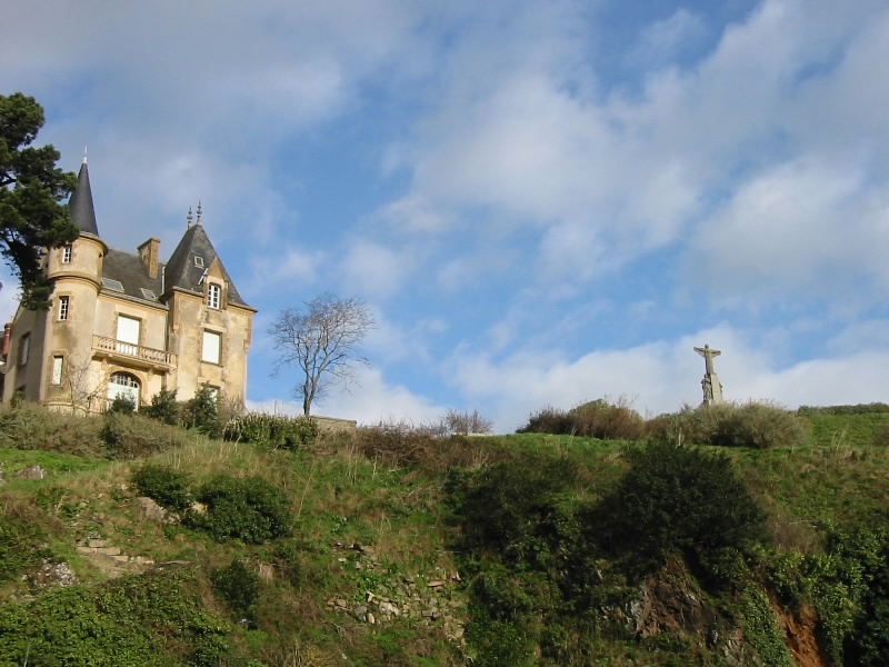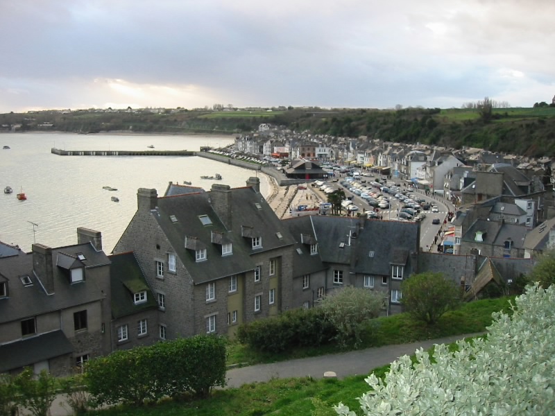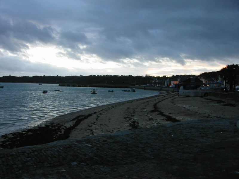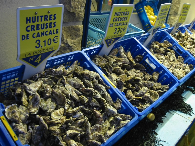 食後は少し散歩だ。まずはインフォメーションへ行こう。港から伸びる坂道をずっと登り、登り切ったところにいくつかお店がある。そんな中にインフォメーションはあった。明日はここからディナンに日帰りするのだが、毎回タクシーを使うわけには行かないのでサンマロまでのバスの時刻表をもらう。朝のうちに港から何本かあるので、それで行けばいいわけだな。これでちょっと一安心だ。インフォメーションの前は広場になっており、そこにはわりと新しい感じの教会があった。カンカール、こじんまりとしたきれいな街だな。カキもうまいし、気に入ったぞ。スーパーがあったので水だけ買い(@0.18E)、街歩き再開。さっき登ってきた道よりも一本隣の道を戻ろう。このあたりは住宅街らしく、石造りの家が並んでいる。静かな、いい雰囲気だ。しばらく行くと海が見渡せるところまで出てきた。ここには像があり、海を見下ろしている。遠くにはモンサンミッシェルがぼんやりと浮かんでいる。ここからは泊まっているホテルをすぐ近くに見下ろすことができ、その向こうにカンカールの街が広がっている。夕暮れのカンカール、いい感じだ。海からの風が心地好い。しばらくのんびりと過ごした後、坂を降りる。降り切ったところにはカキの露店が出ており、いろんな種類、大きさのカキが売られている。車で来ている人たちがこれを買って帰るんだろうな。ちょっと体が冷えたので、一旦ホテルに戻り少し休憩。