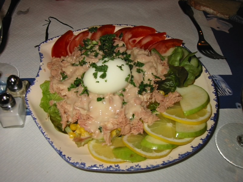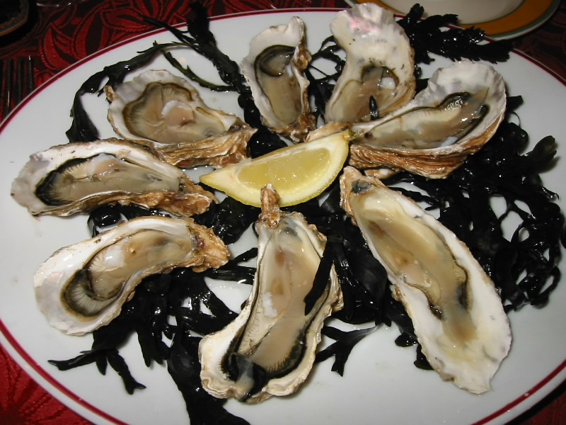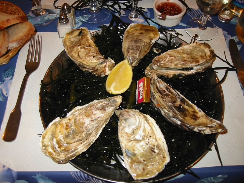 しばらく部屋でのんびりしているうちに、7時を回った。そろそろ行きますか。目的のレストランには、もう何組か客が入っている。注文するものはもう決まっているので、入りますか。No.0のカキが6個のと、カキグラタン。これは3種類の盛りあわせのようだ。これだけでは野菜不足なので、あとツナサラダを頼む。ワインはハウスワインで十分、まずは乾杯だ。お店もだんだんとにぎわってきたぞ。しばらくして一組みの家族が入ってきたのだが、なんと大きな犬連れ。こんな大きな犬をつれてレストランに入るのもありなのだ。その代わり当然だがきちんとしつけられているらしく、すぐにテーブルの下でおとなしくなった。さて、カキはまだかな。このあと随分待たされる。他のテーブルはどんどん運ばれてくるのに、単純な前菜の生カキがなかなか来ない。No.0は割りにくいのか、それとも実はあまり頼む人がないので買いにいったのか、ひょっとしたら海に取りにいったのか、本当にそう思うほど待たされる。30分ほどしてようやく到着。待ちくたびれたが、出てきたものは実に素晴らしい。昼のカキとは比べ物にならないくらいに大きい。これにレモンをかけ、ちゅるっと食べる・・・うまい。うますぎる。まさに口いっぱいに広がる海の香りだ。さすがにこの大きさだと食べごたえがあってうれしいぞ。この一皿で8E、1000円ほど。安いものだ。続いてカキのグラタン。さっきの生カキよりは小さいが、それでもNo.2くらいだろうか、わりと大きめだ。2個づつ3種類のっており、クリーム、トマト、バターといったところ。これがどれもおいしいのだ。それぞれのソースもうまいのだが、さらにそれにカキの風味がたっぷりと染み込み、ソースだけでも海の香りを感じることができる。もちろんカキもおいしい。カキの温かい料理を外国で食べたのは始めてだが、これは気に入りました。ああ、食べるとなくなっていくのがおしい・・・おいしかったです。