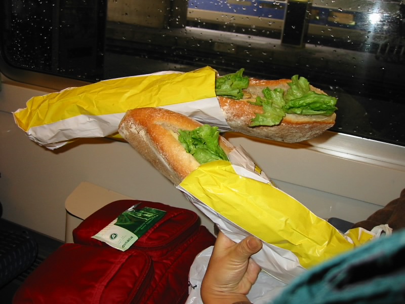 しばらくしてタクシーが到着。さっそく乗り込み、サンマロへと向かう。タクシーは田園風景の広がる田舎道を快調に走り、サンマロ到着(30E)。そしてレンヌ行きの電車を見ると・・・15分ほど前に出てしまい、次のは3時間後の12時57分。なんてことだ。やはり最初からタクシーにしておけばよかった・・・がっかり。ナントまでの切符を買い(48.40E)、とにかく朝ごはんだ。この近くのカフェはまだ準備中のようなので、英仏珍道中のときにも行ったパンやさんへ。クロワッサンとチョコレートパンを買い(3.1E)、駅に戻る。待合室でパンを食べるが、なんだかショックが抜け切れない。自分の見込みの甘さに対するショックだ。うーん、何度旅をしているのだ、サンフランシスコの教訓は何なのだ・・・2003年の幕開けは、自分を見つめなおし、戒める幕開けとなった。今年はより確実を目指さなければ。今ひとつ味の分からない朝ごはんを終え、さてどうしようか。まだ2時間以上あるし、あまり雰囲気のいい待合室でもないし、どうしたものか。駅前のカフェもまだあきそうにもないので、いっそのことサンマロの旧市街まで行ってしまおう。駅からまっすぐ伸びる道を歩く。2年前にも歩いた道だ。荷物が重いが15分ほどで城壁まで到着。なんだか急に雲行きが怪しくなってきたぞ。城壁を入りすぐ近くのカフェに入り、ほっと一息つくと突然の大雨。ものすごい雨が急に降ってきた。もう3分駅をでるのが遅かったら、もう全身ずぶぬれになってしまっただろう。なんというタイミング、不幸中の幸いか。カフェではゆっくり紅茶を飲む(6.7E)。